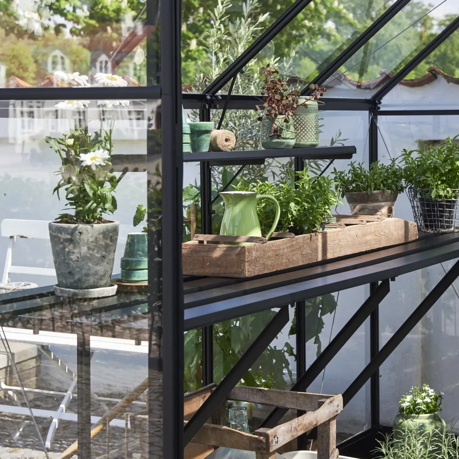 Drivhusbordet monteres nemt i drivhusets aluminiumsprofiler med de medfølgende hyldeknægte