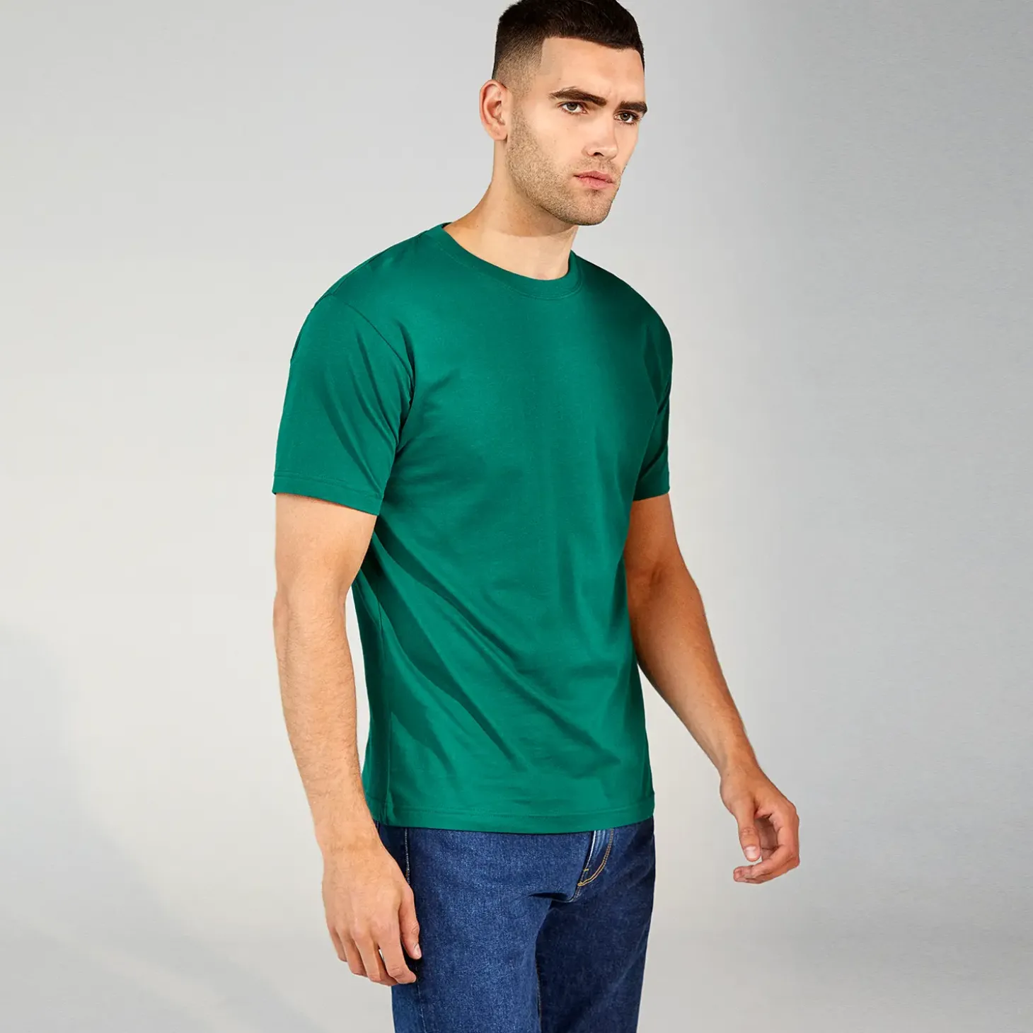 Klassisk T-shirt med rund hals, fire-lags halsrib og nakke- og skulderbånd. Holder faconen vask efter vask.