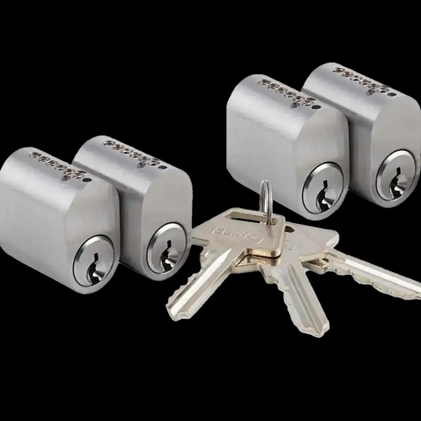 6-stift oval cylindersæt. Sættet består af 4 stk. enslukkende ovale cylindre inkl. tre nøgler. DS/EN 1303-godkendt.