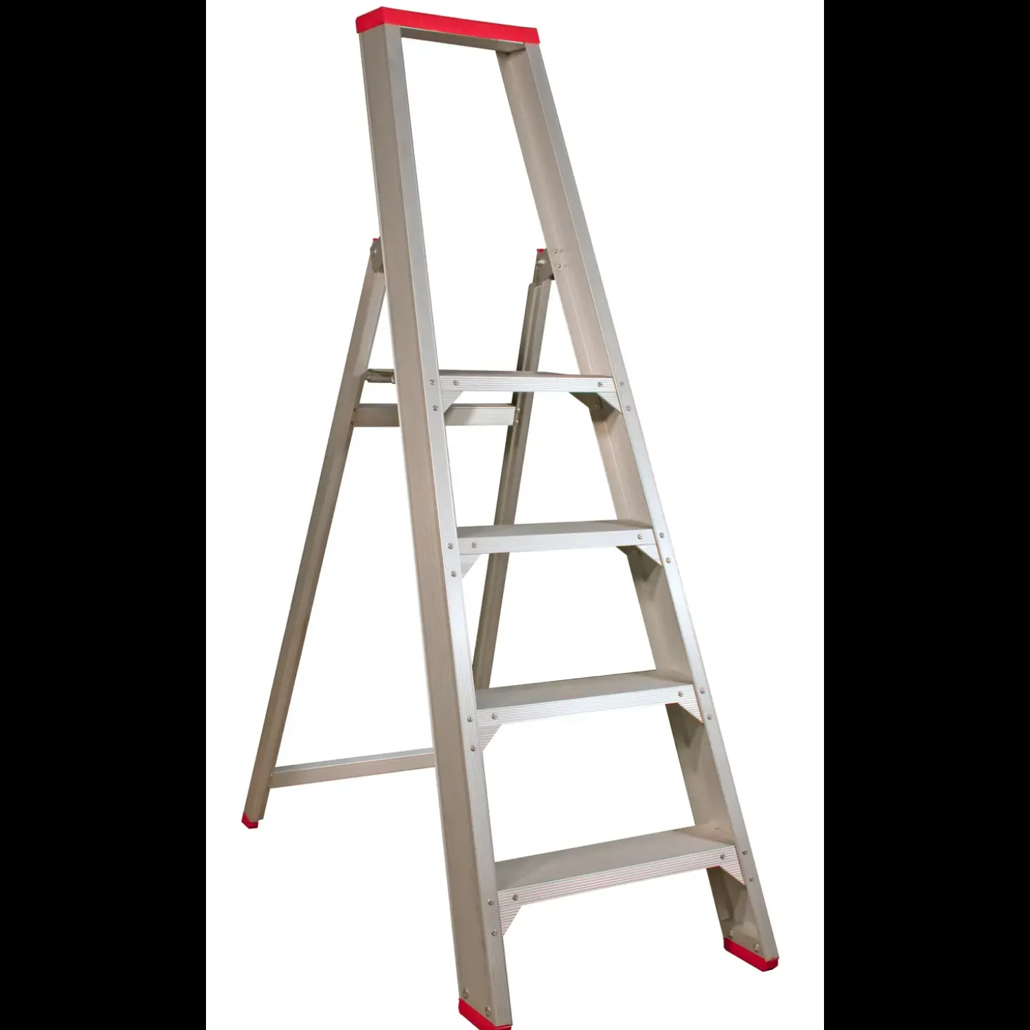 Solid trappestige fra Jumbo med stor platform og bøjle med værktøjsbakke, med solid støttebøjle for ekstra sikkerhed og komfort. Trappestigen har kraftige vanger med elokseret overflade, samt udarbejdet med 12-punktssamlinger og kraftige hjørneforstærkninger på alle trin.