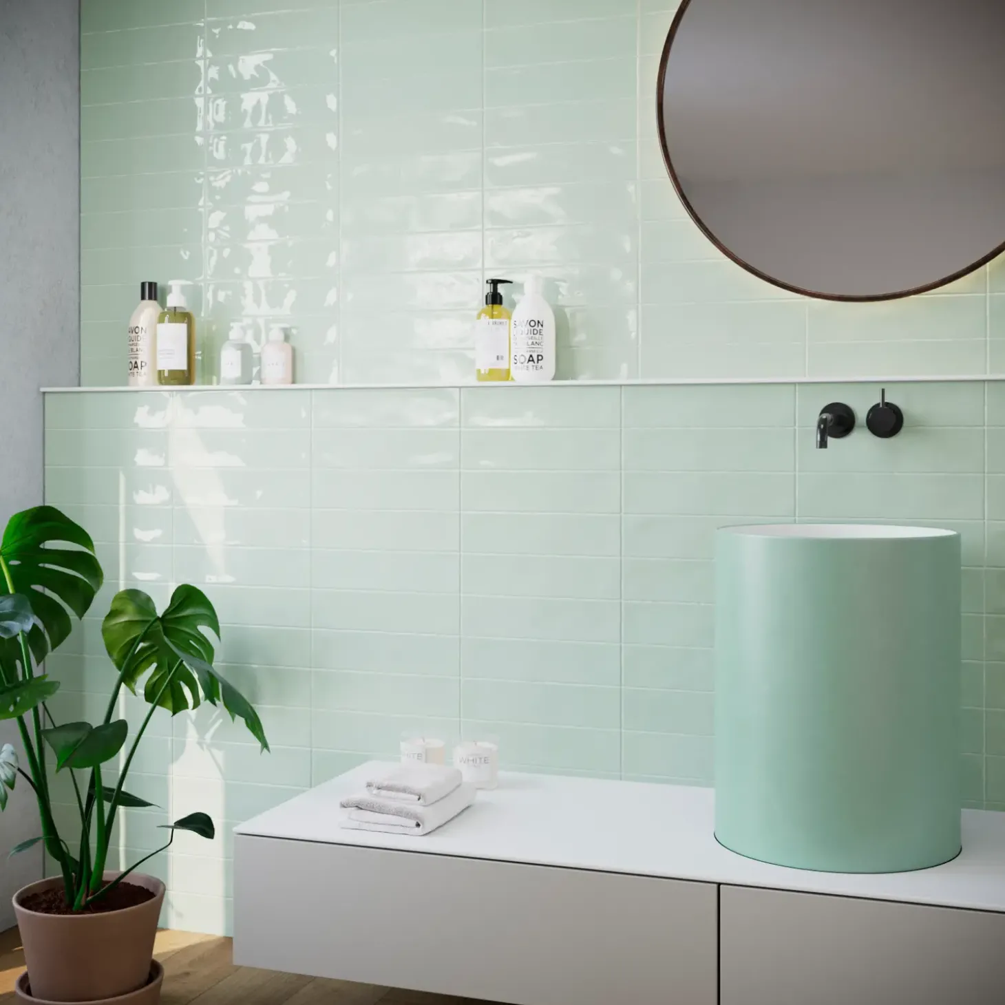 Keramisk flise i blank højglans, særlig velegnet til køkken, bad og andre vådrum.