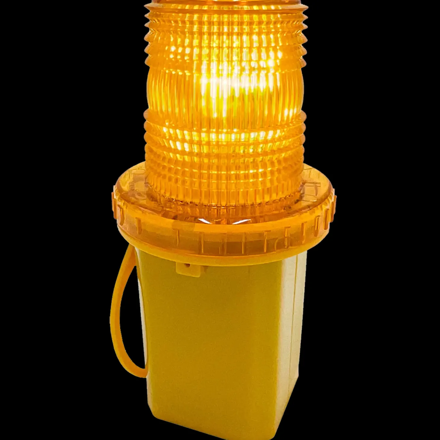 LED-Blinklygte med gul linse. Passer til Afspærringscylinder og som containerafmærkning. Blinklygte uden fotocelle. Anvender 6V batterier m. fjedre.