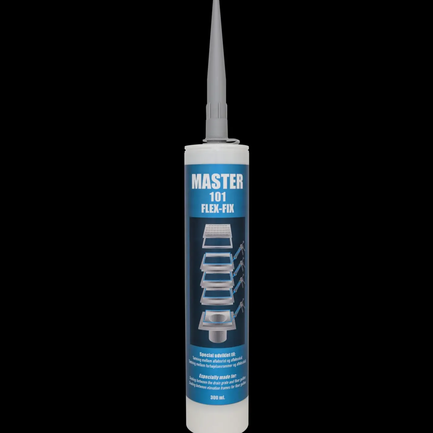 Master 101 flex-fix tætningsmasse der er velegnet til tætning mellem afløbsrist og afløbsskål samt tætning mellem forhøjelsesrammer og afløbsskål.