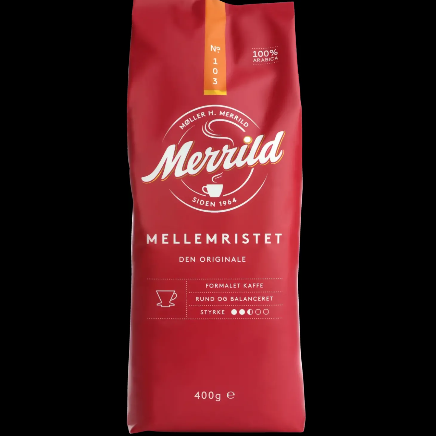 Merrild Mellemristet No. 103 er en rund og fyldig filterkaffe af mellemristede Arabica-bønner, som gør kaffen perfekt afbalanceret. Kaffen er et blend af 70% naturlig Arabica fra Sydamerika og 30% vaskede, håndplukkede Arabica-bønner.