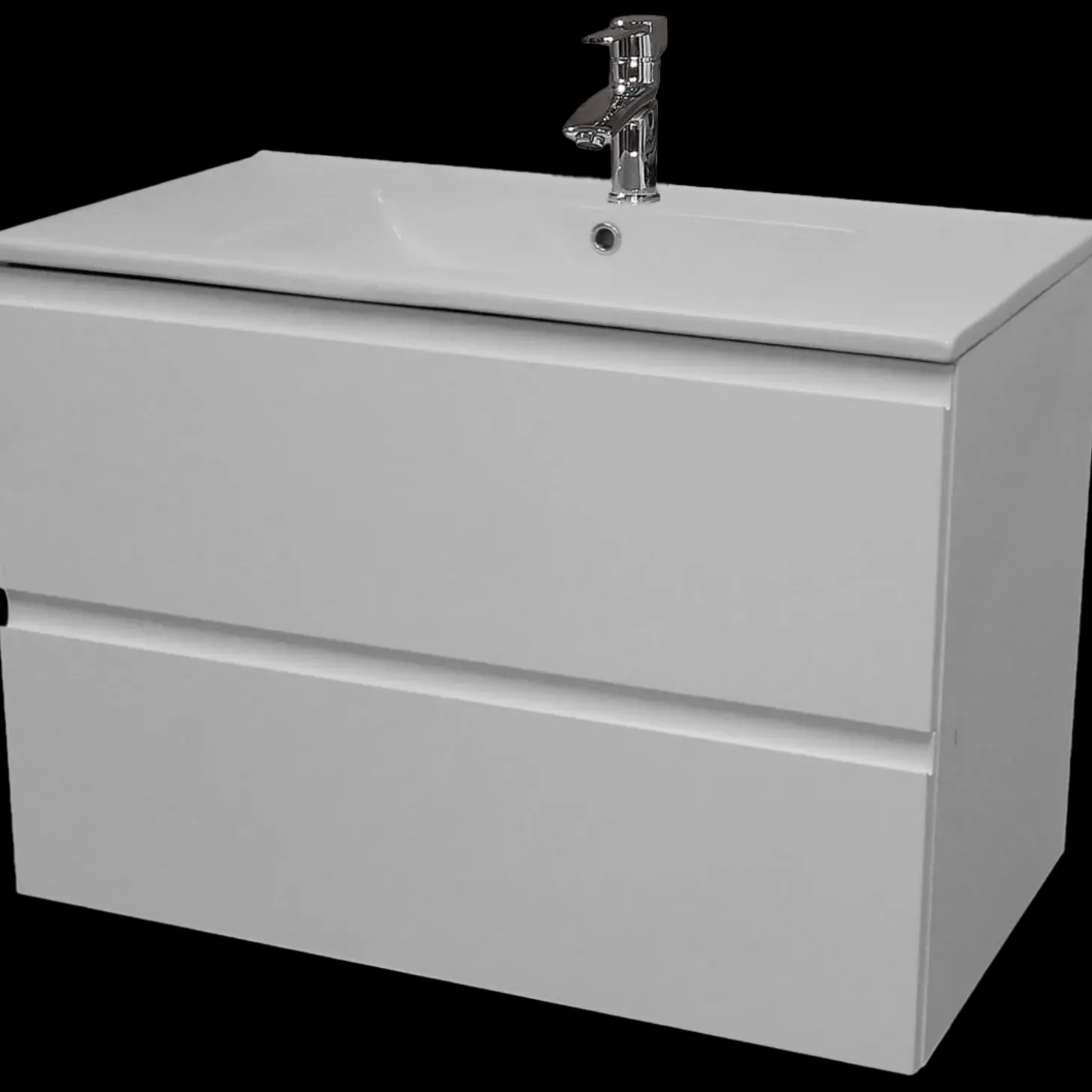 Flot og enkelt badsæt i hvid højglans 80 cm. Det er bestående af en porcelænsvask og to grebsfri skuffer med soft close.