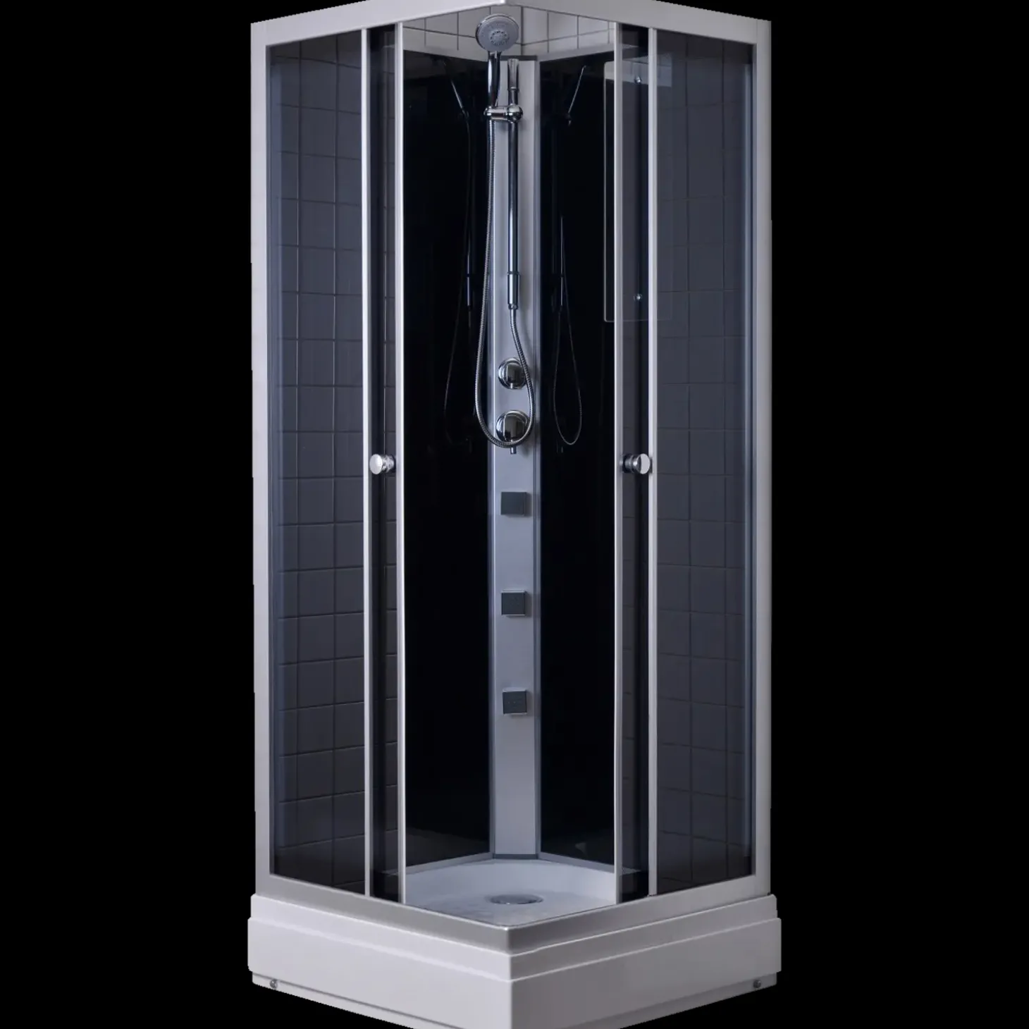 Komplet brusekabine med massagedyser, bundkabine og spejl. Den fremstår i gråtonet glas. Du får nærmest en wellness lignende oplevelse, når du træder ind i din Rondo brusekabine.