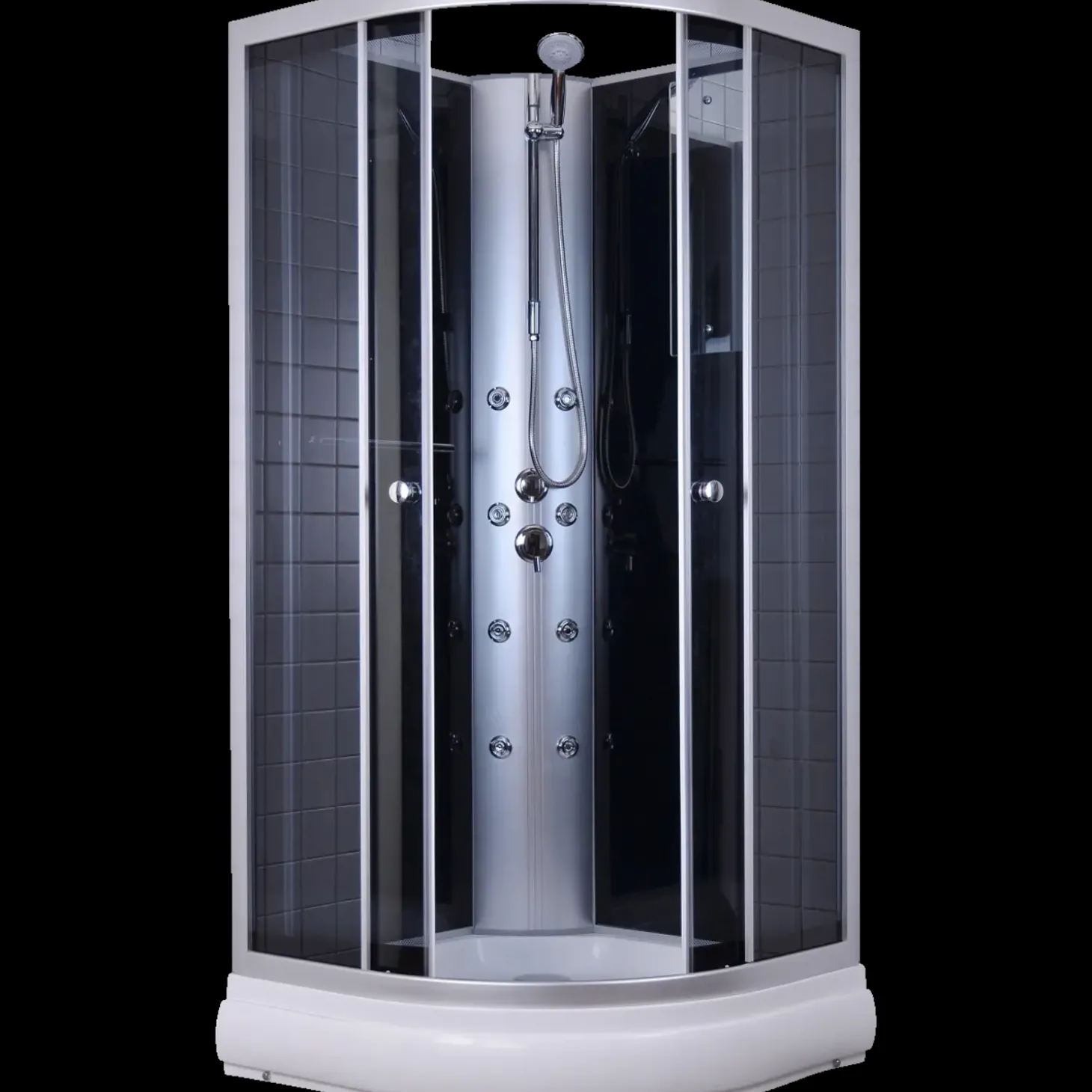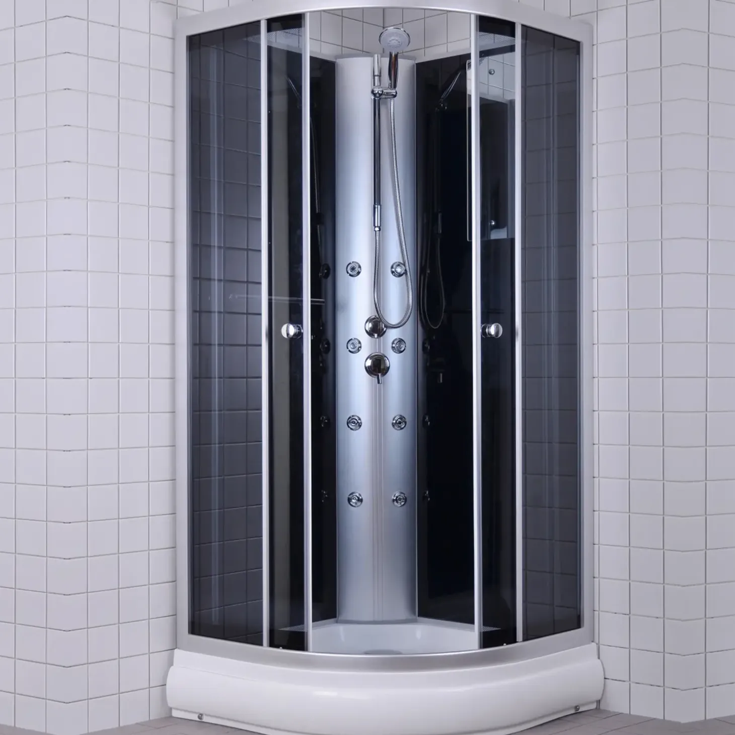 Komplet brusekabine med massagedyser, bundkabine og spejl. Den fremstår i gråtonet glas. Du får nærmest en wellness lignende oplevelse, når du træder ind i din Rondo brusekabine.