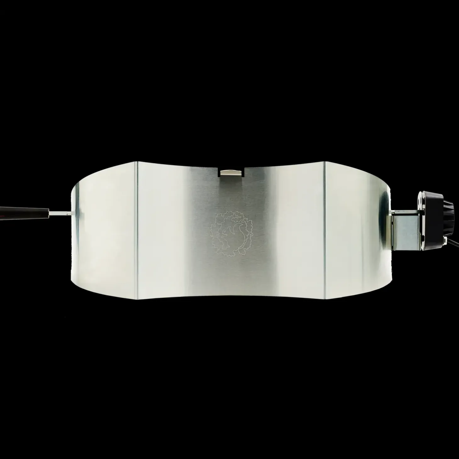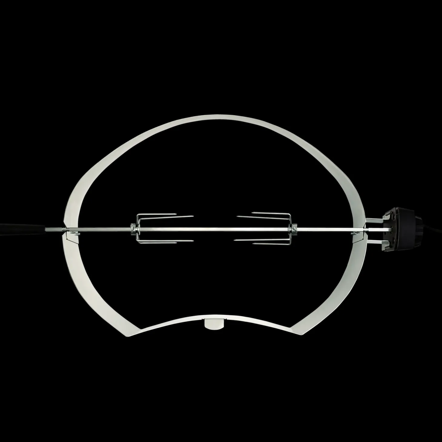 Funktionelt rotisserie til Morsøs populære Forno Gas Grande. Den smukt buede skærm i rustfrit stål kiler sig elegant ind under grillens låg og skaber derved god plads til at rotere selv store mængder, og der er plads til en saftopsamler mellem spyd og grilllegeme.