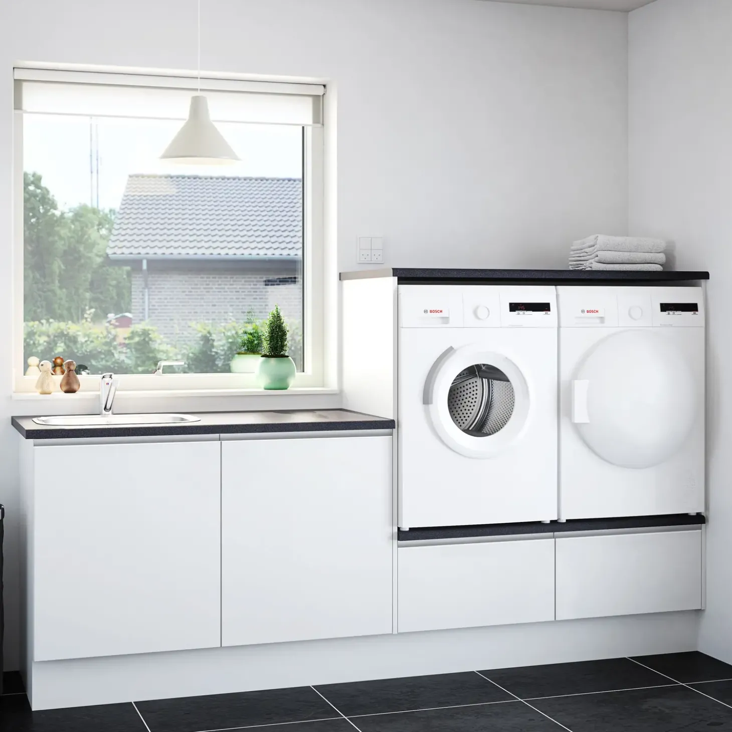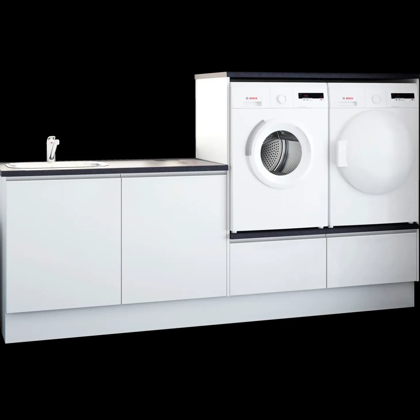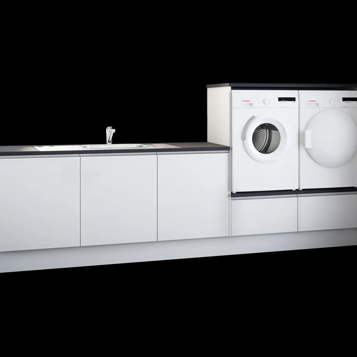 Multi-Living bryggerssæt Monaco med grebsfri låge. Bryggersskabet er lavet af 100 grams melamin, som er langt højere end den gennemsnitlige standard. Dette giver en slagfast, glat og hård overflade, som er farvebestandig, og meget nem at vedligeholde. Kanten på skabet er lavet af en stødabsorberende 1,0 mm ABS-kant. Alle hængsler og udtræk er med integreret softclose som standard og er af meget høj tysk kvalitet. Skabene er med skjulte samlinger og minifix beslag.