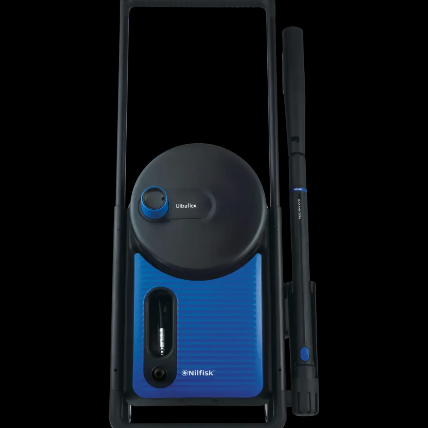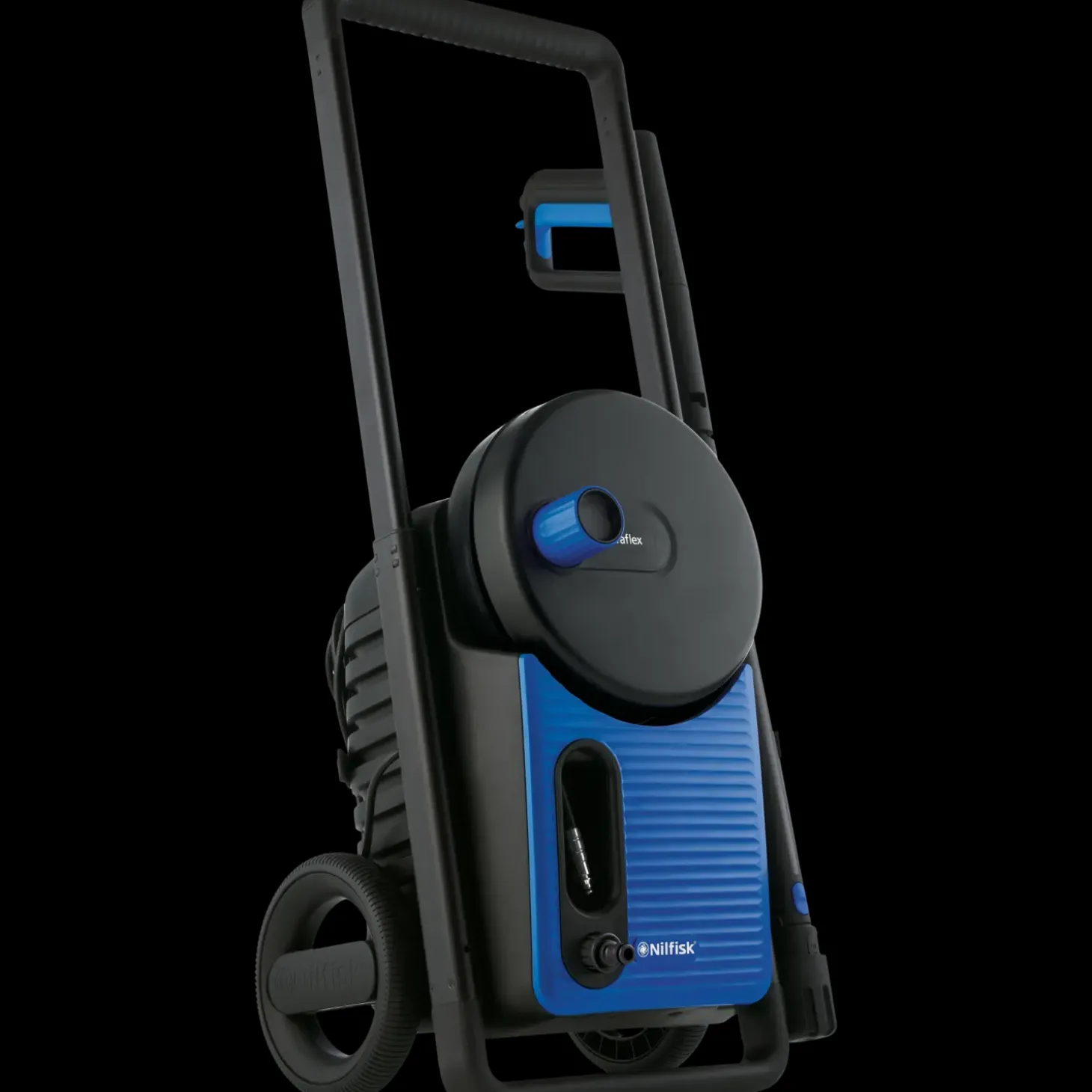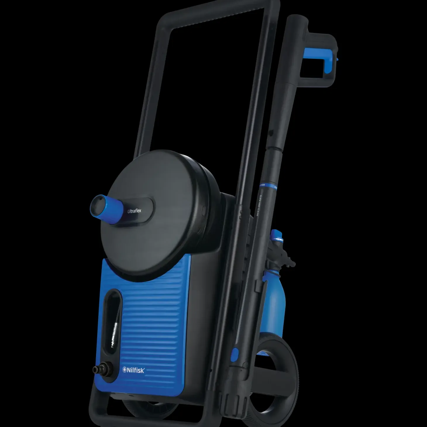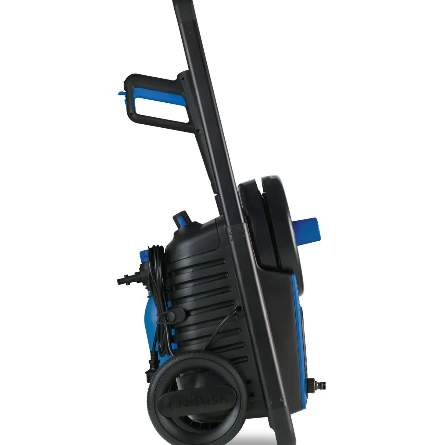 - Slange er nem at rulle op og kan opbevares inde i maskinen, så du sparer plads