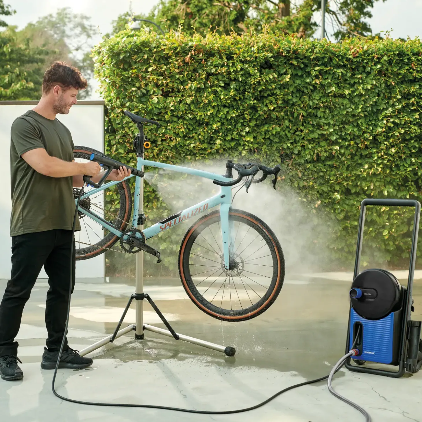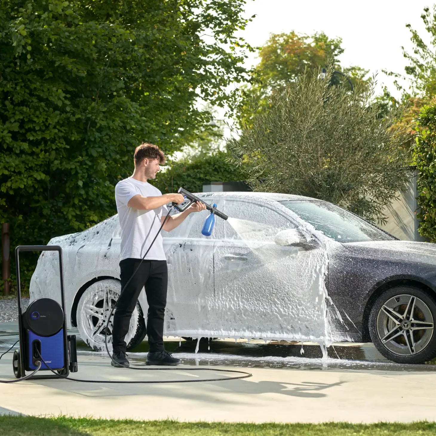 Denne kraftfulde højtryksrenser klarer alle dine daglige udendørs rengøringsopgaver – hvad enten det er rengøring af terrasse, bil, havemøbler eller cykler. Den 10 meter lange slange giver god fleksibilitet under arbejdet og kan nemt gemmes væk i den integrerede slangerulle efter brug. Du kan både bruge højtryksrenseren til rengøring på sarte overflader og til at fjerne indgroet snavs.