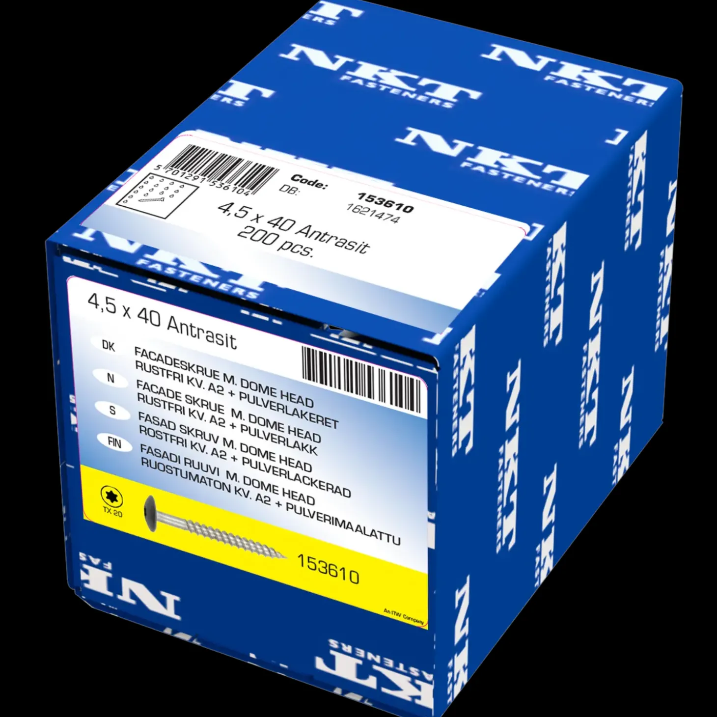 NKT Facade+ D er en A2 rustfri facadeskrue, som med sit kugleformede store hoved og flade underside efterlader en pæn finish, samt god efterspænding af emnet.