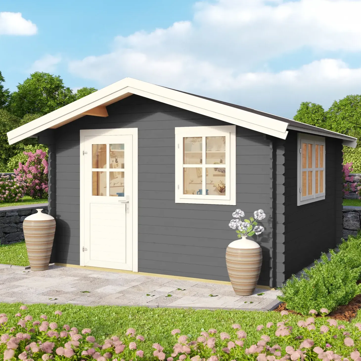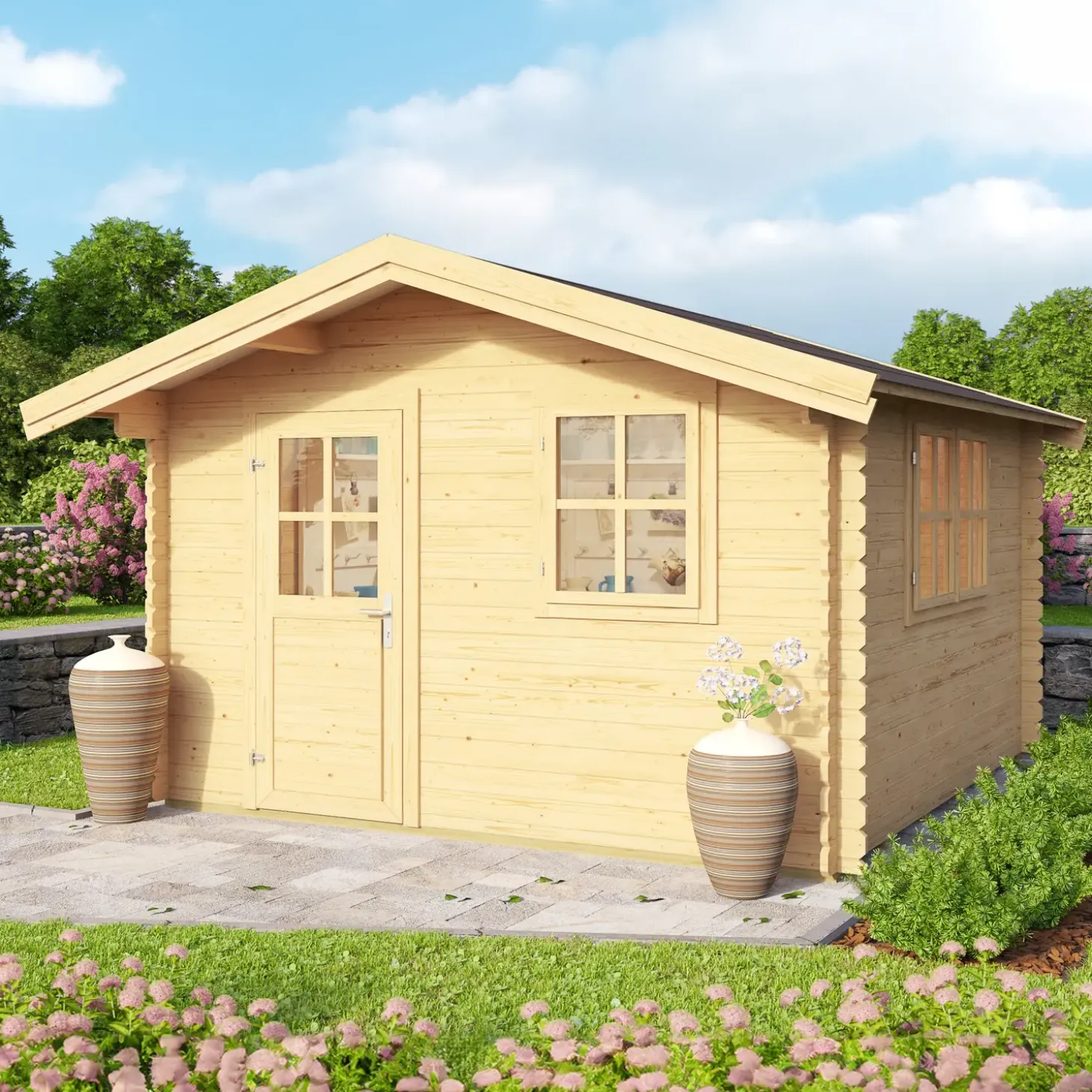 Hytten er fremstillet af 28 mm bjælker i 100 % naturligt og levende træ, der ikke er behandlet. Du vil derfor kunne opleve at træet har forskellige toner, hvilket sikrer dig en unik hytte hvor hver en detalje, tekstur og grenmønster er sin egen. Hytten er fremstillet med enkelt dør med glas samt vinduer i siden giver et fint lysindfald, samtidig med at det giver flere muligheder for indretning. Det anbefales at hytten får monteret underpap og et permanent tag, såsom overpap eller stålplader.
