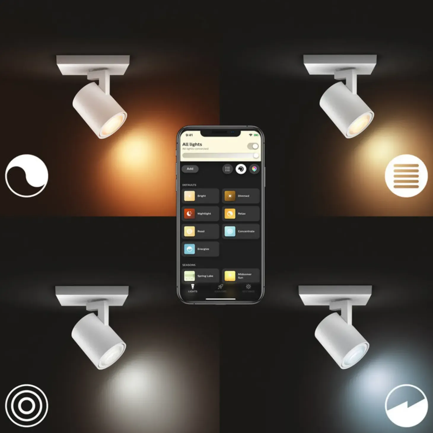 Philips Hue White Ambiance gør det muligt, at tilpasse din belysning i hjemmet efter dine præferencer. Nyd de tusindvis af behagelige nuancer, lige fra det varme til det kølige hvide lys. De mange lysnuancer kan både hjælpe dig med at vågne, få energi og slappe af alt efter hvad dit behov er. Med Hue White Ambiance kan du udover at skifte nuancer også dæmpe lyset for, at opnå den rette stemning i hjemmet.