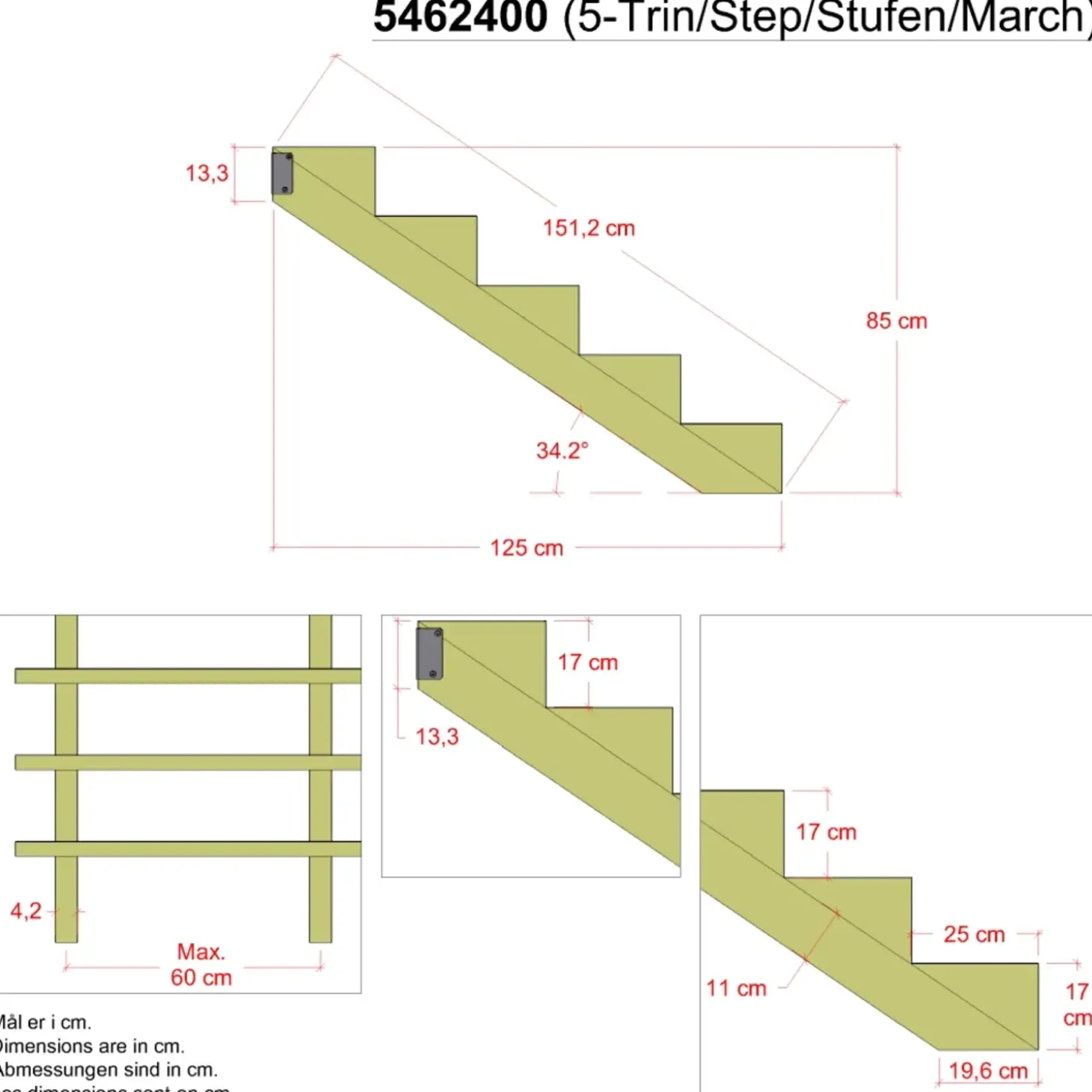34,2° Træ Trappevange 5-trin m/beslag – Trindybde 25 cm – 5462400