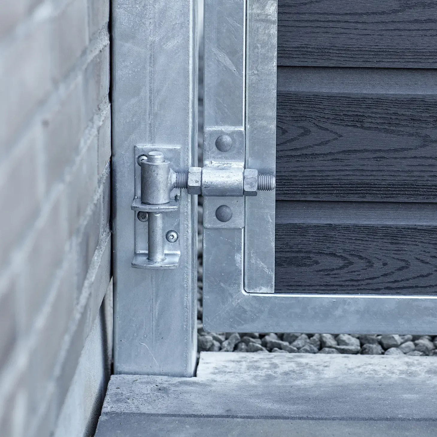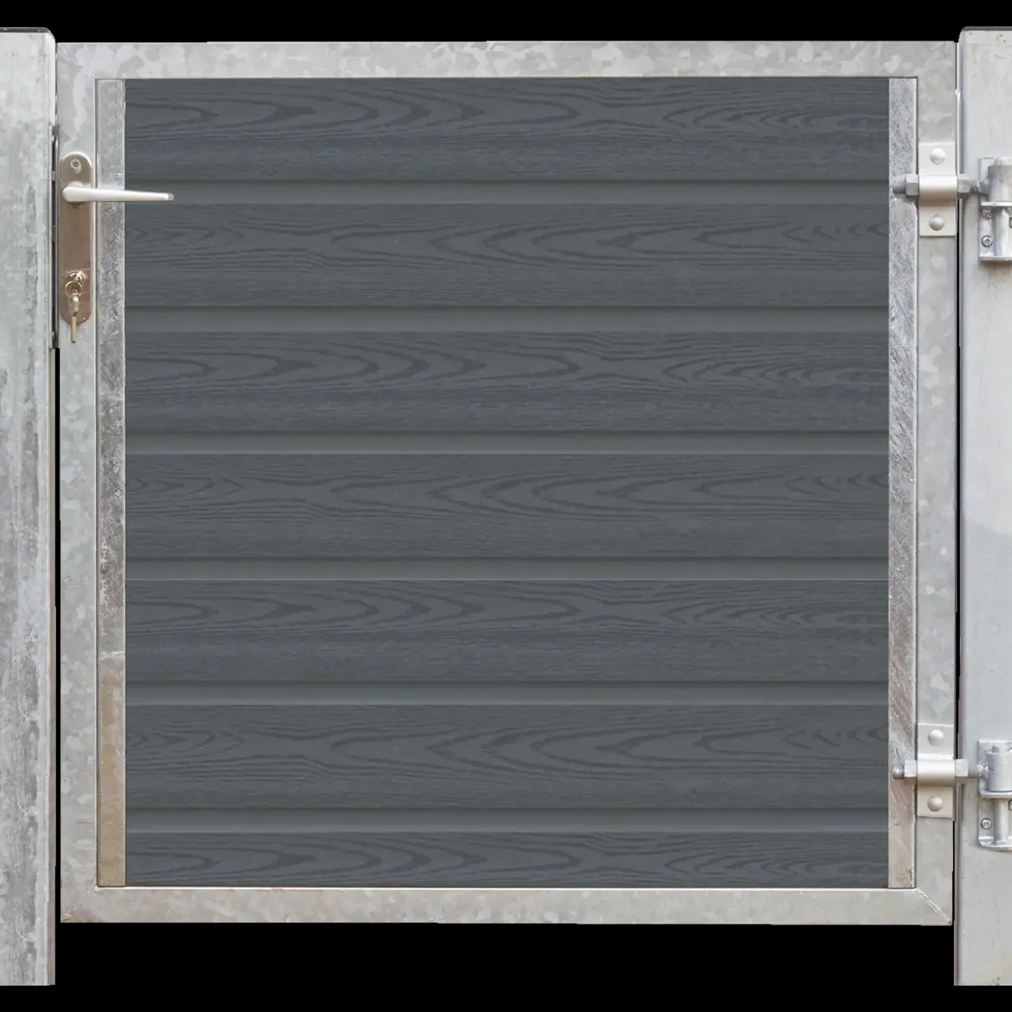 Højrehængt og indadgående låge med varmegalvaniseret ramme med kompositbeklædning.