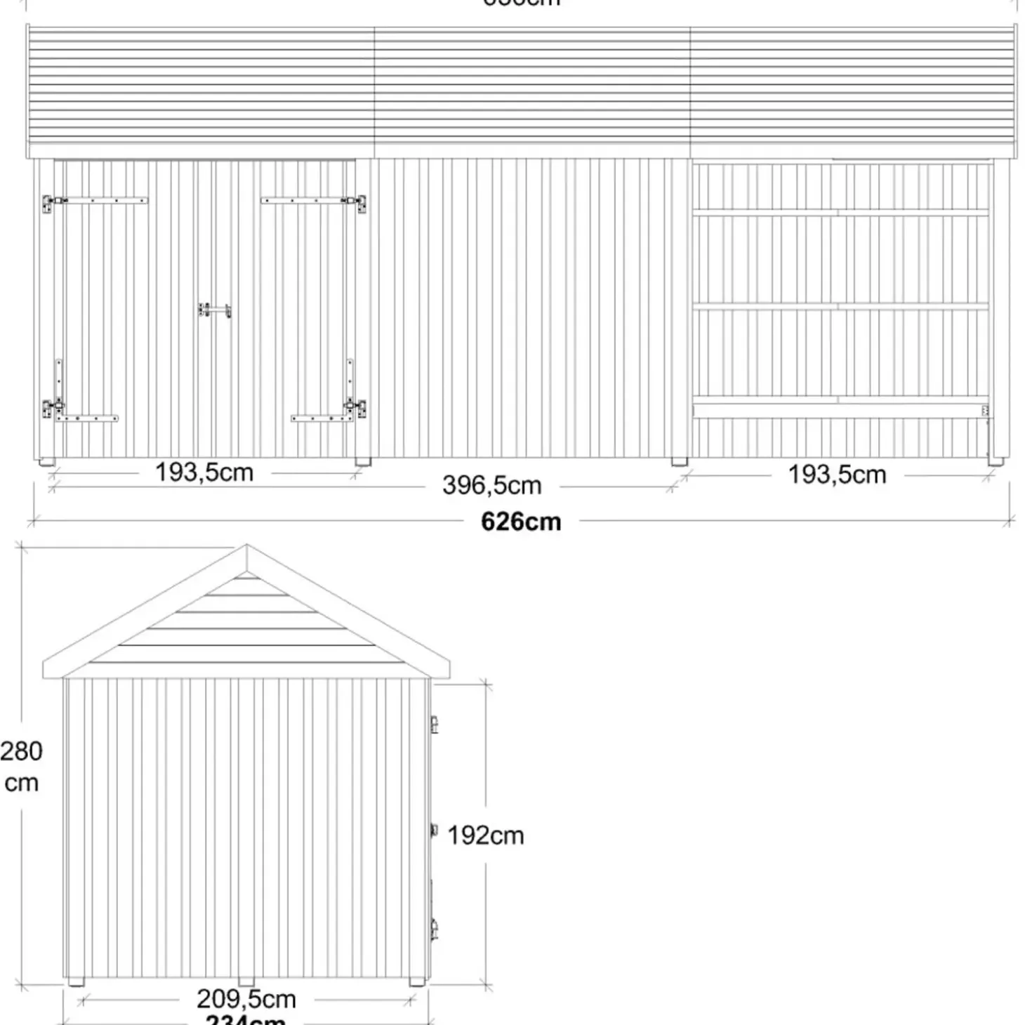 Gavlbeklædning: 19×120 mm klinkbrædder. Inkl. skillevæg.