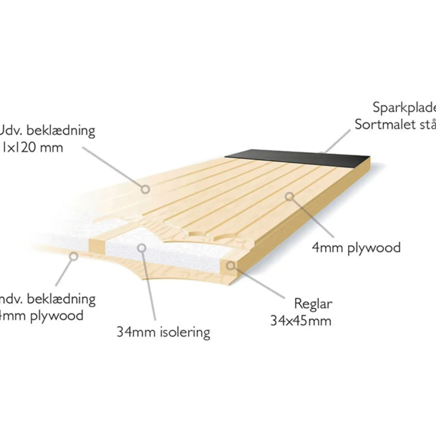 Døren kan blandt andet anvendes i uopvarmede rum, f.eks. anneks/redskabsrum med begrænsede temperaturforskel mellem inde og ude (Max 10º C). Døren er 52-55 mm. tyk og er isoleret med 34 mm. desuden har døren nederst en sort stål sparkplade på 15 cm.