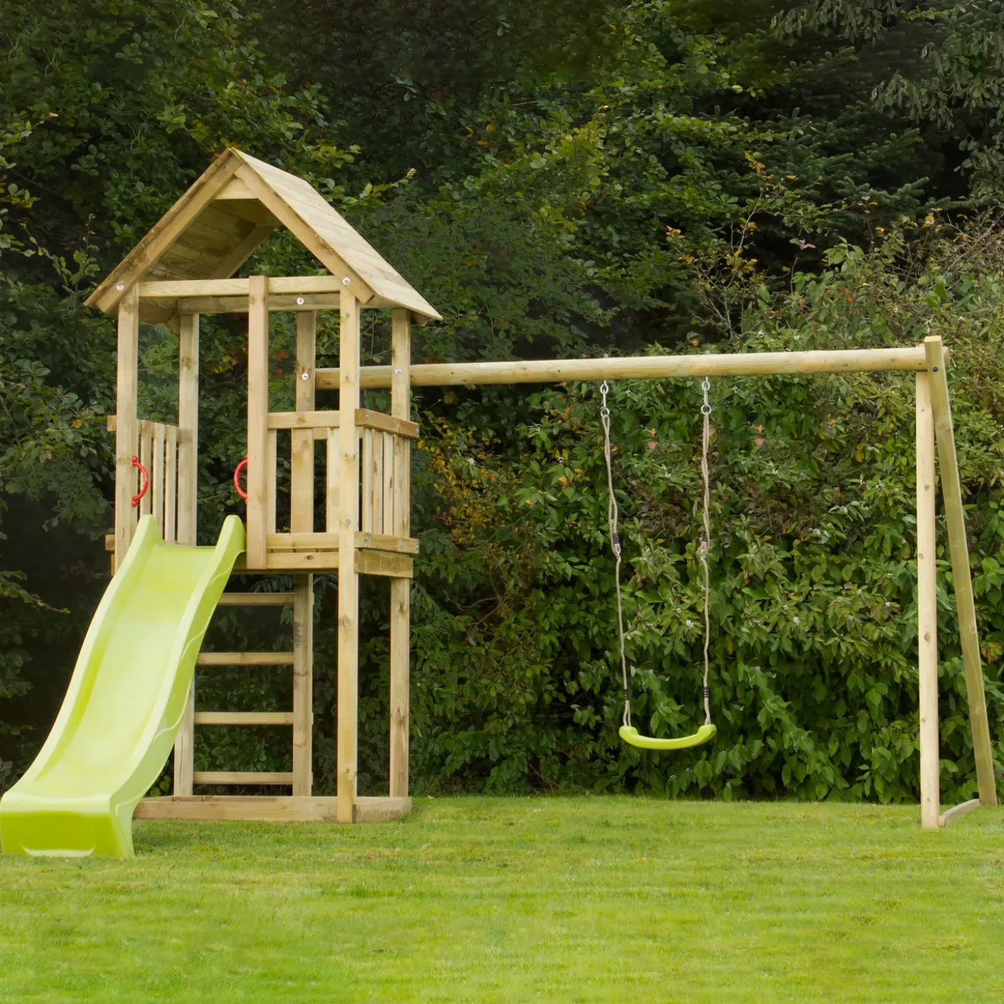Plus legetårn er fremstillet i trykimprægneret gran i den velkendte kvalitet fra danske Plus. Her får du et legetårn inkl. gyngestativ med et grønt gyngesæde i bedste kvalitet som børnene vil have glæde af i mange år fremover og hvor du trygt kan lade dem lege i timevis. Legetårnet er udstyret med stige op til platformen hvorfra de kan tage den grønne rutchebane på nedturen og derefter tage en tur på gyngerne.