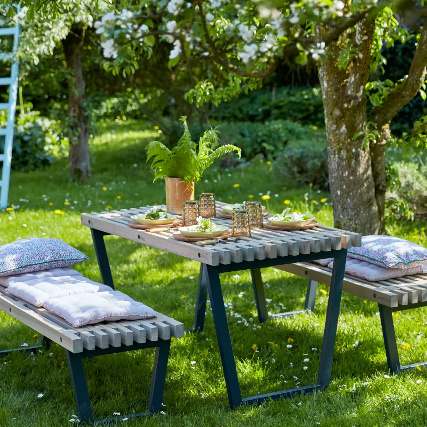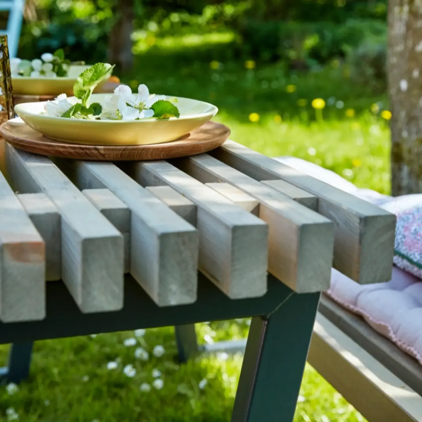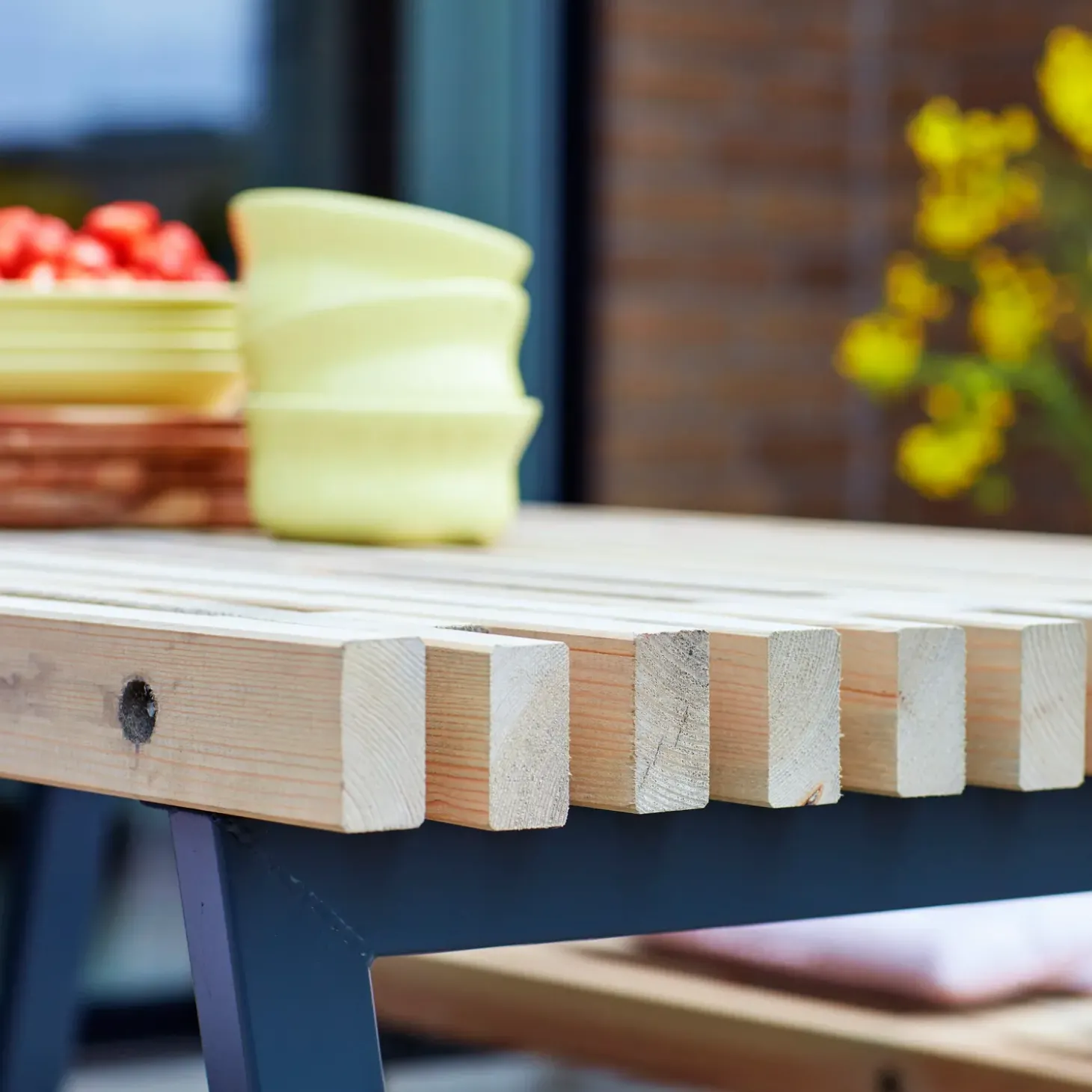 Fint bord- og bænkesæt til haven bestående af 1 bord med tilhørende 2 bænke. Sættet leveres som “saml-selv”.