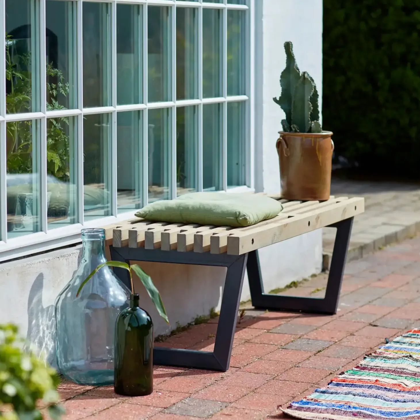 Med Siesta Trallebænk, fremstillet af traller i drivtømmerfarve, får du en rustik sofa, der skaber råhygge på varme sommeraftener. Til bænken findes også en matchende stol og sofa samt hynder og en glasplade så den kan omdannes til et trallebord.