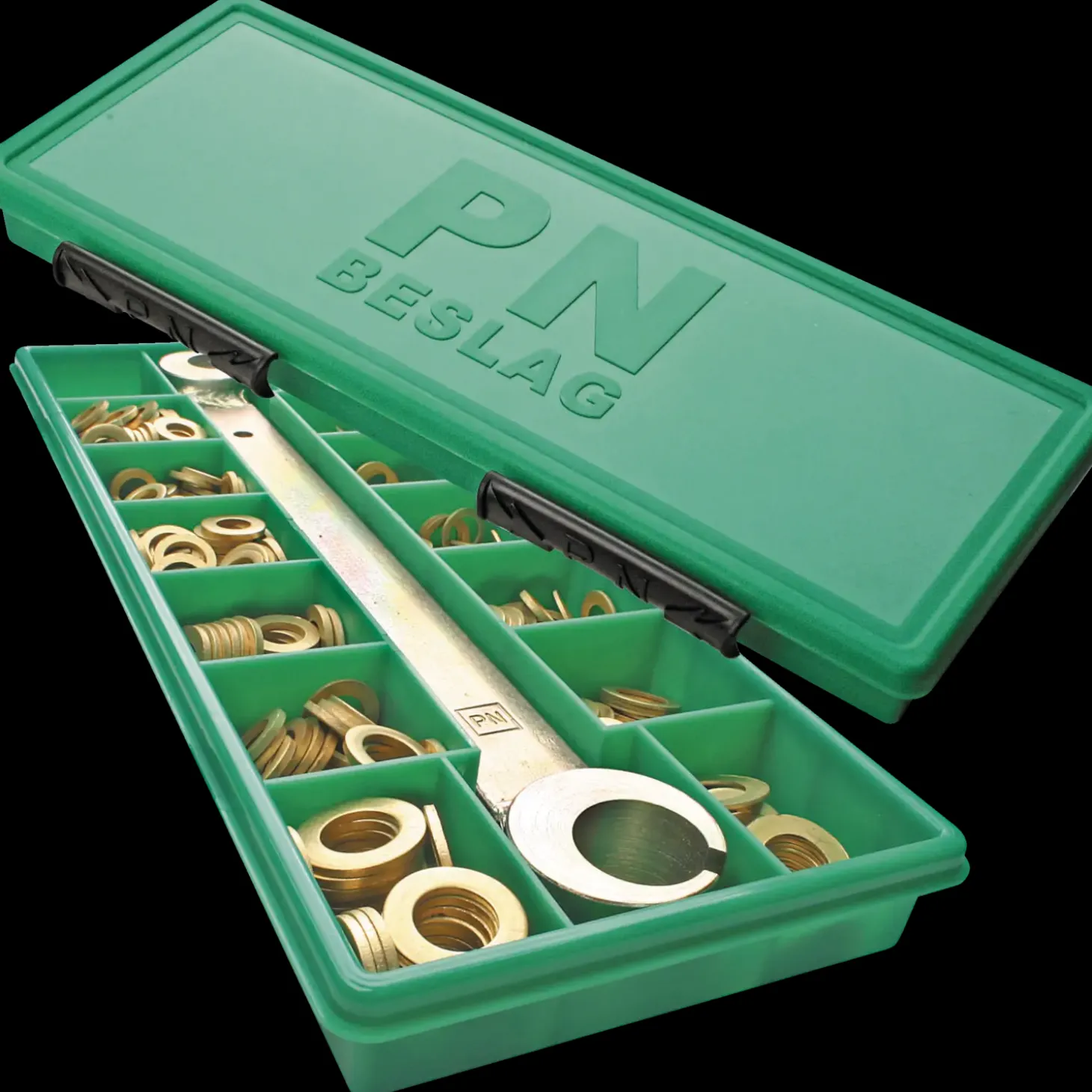 PN messing hængselringe i diverse størrelser. Pakken indeholder 500 stk. dørringe og en hængselsretter.