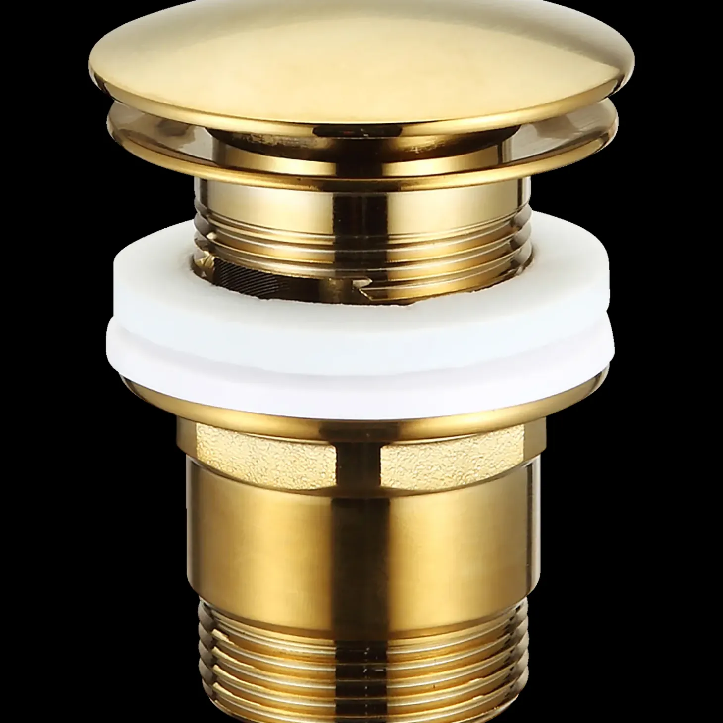 ADORA Exitus bundventil med push pop up og høj omløb, samt 1 1/4 bundventil der måler Ø66 mm i diameteren.