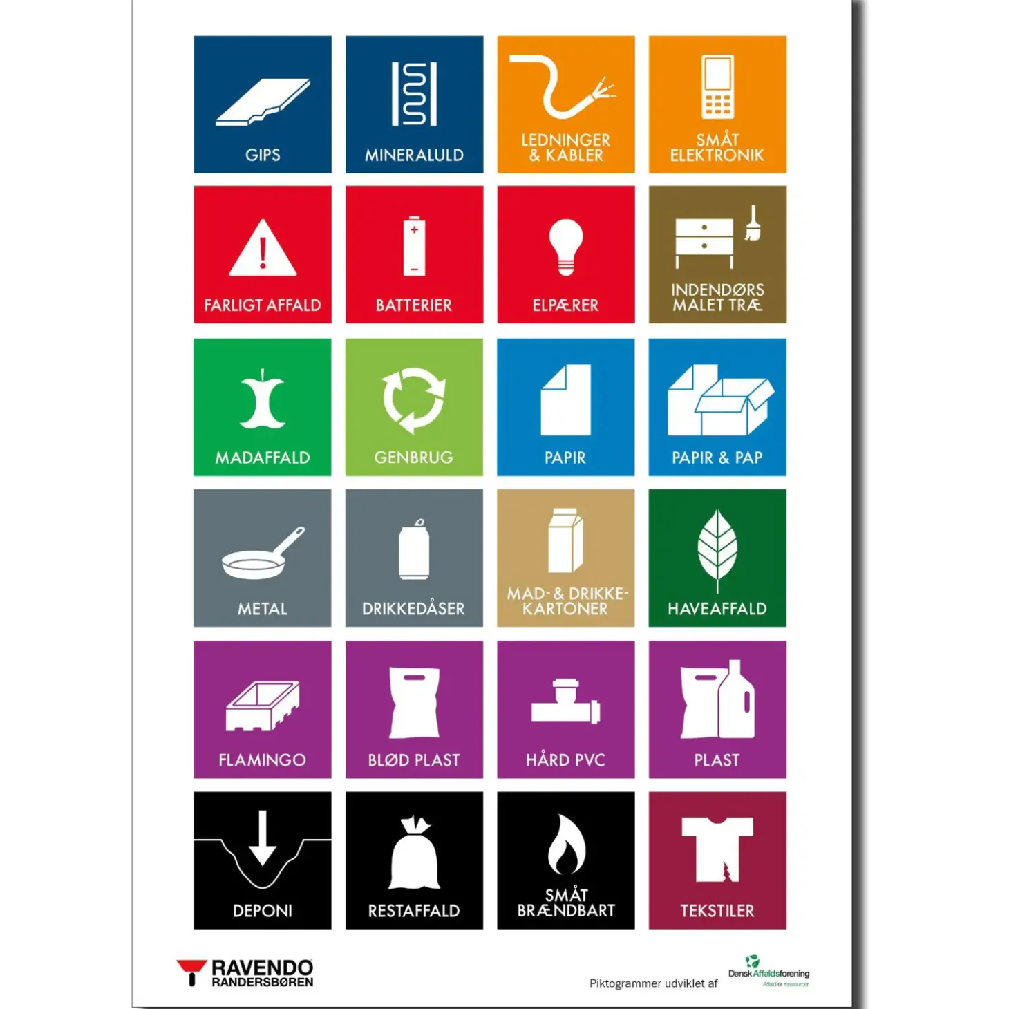 Ark med 24 affaldspiktogrammer for affaldssorteringsstativ.