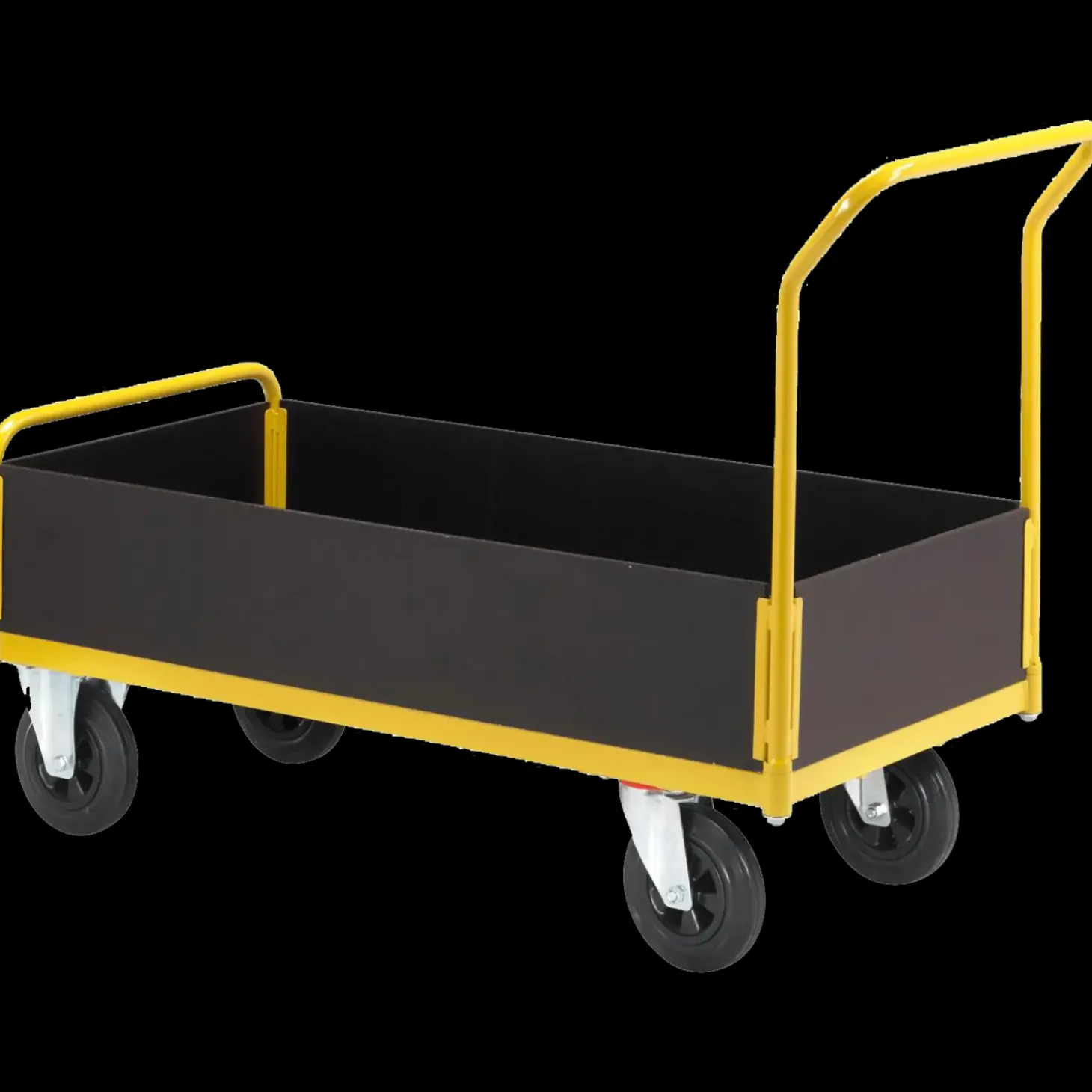 Med høje sider. 650×1250 mm. 400 kg. Hjul: 2 stk 628325 + 2 stk 628326