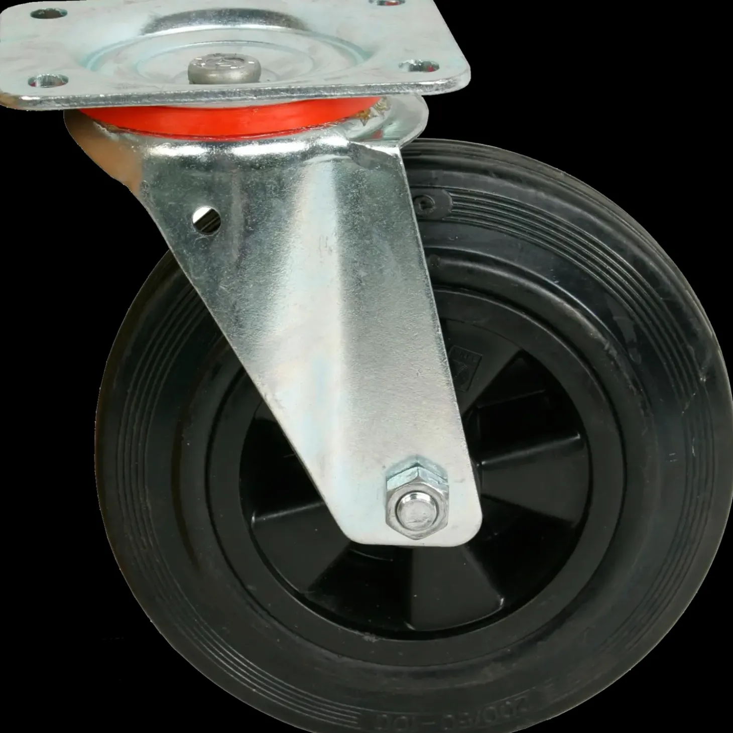 Drejelige gaffel m. monteret hjul, massiv 200 x 50. Plastfælg m. glideleje.