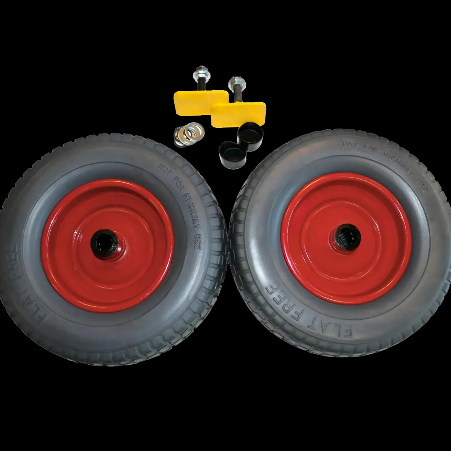 Punkteringsfrit hjulsæt for pallekærre. Består af 2 stk. punkteringsfrie 12″ hjul med 20 x 75 nav samt bremsesko.