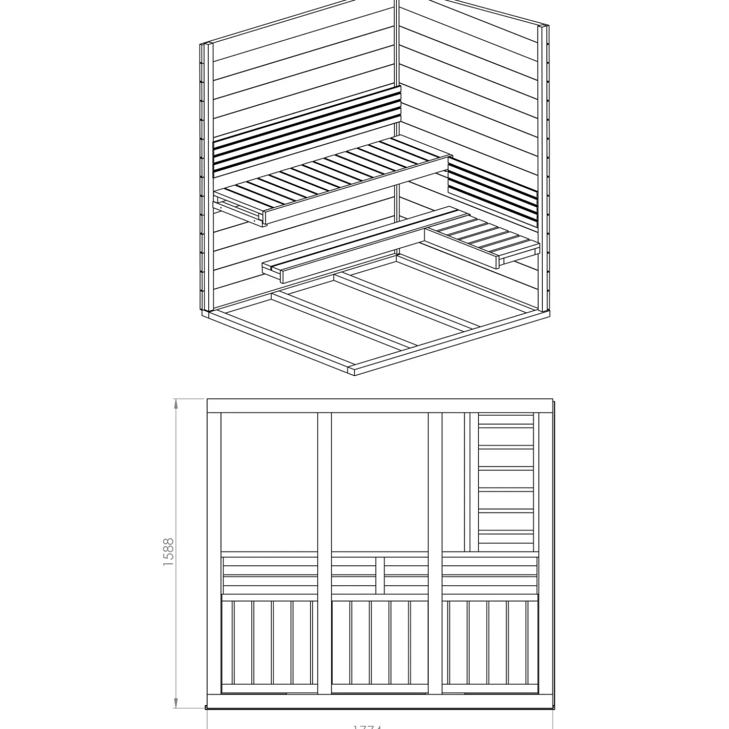 Saunaen leveres uden ovn. Det anbefales at bruge en ovn på minimum 4,5KW og gerne 6KW for at sikre den ønskede temperatur hele året rundt.