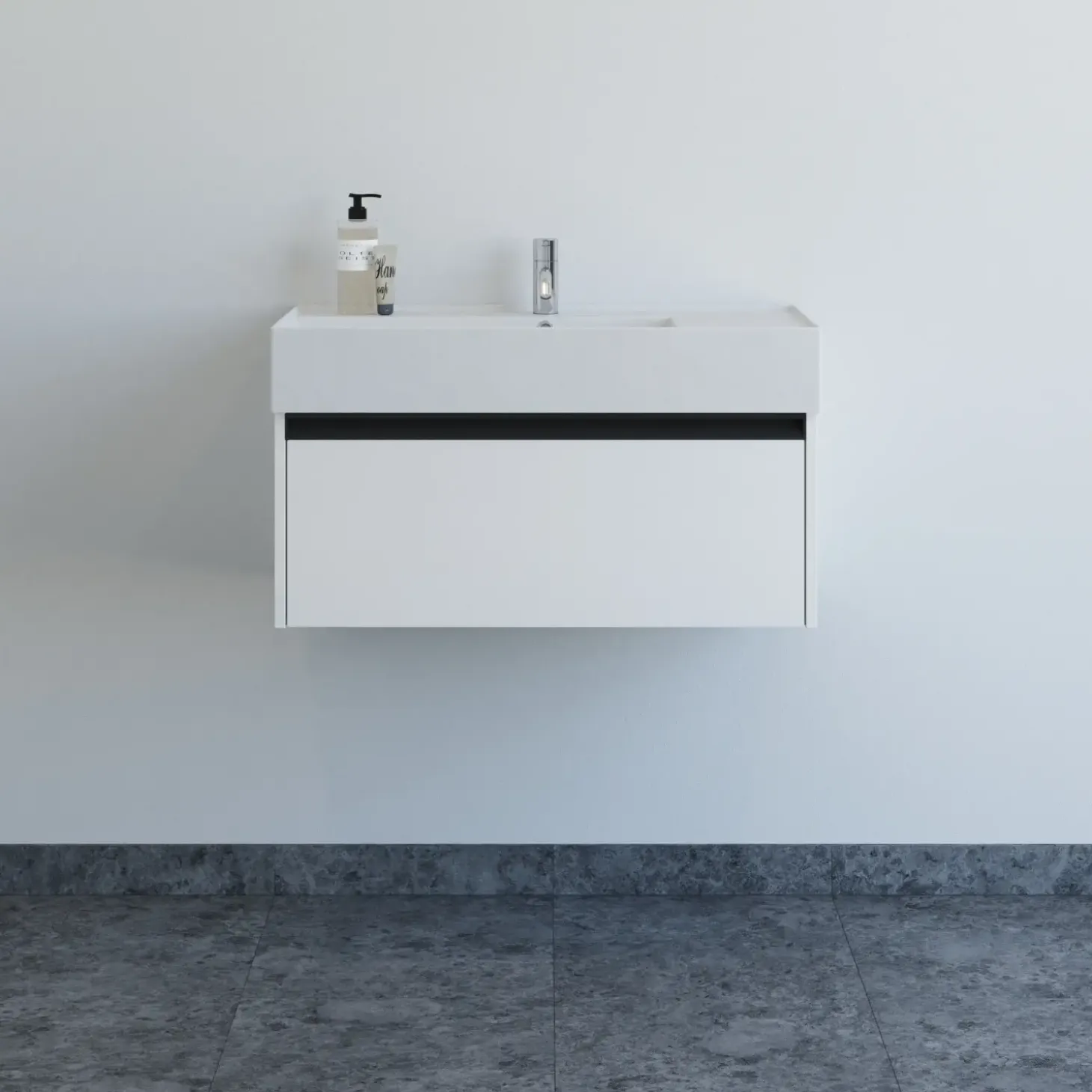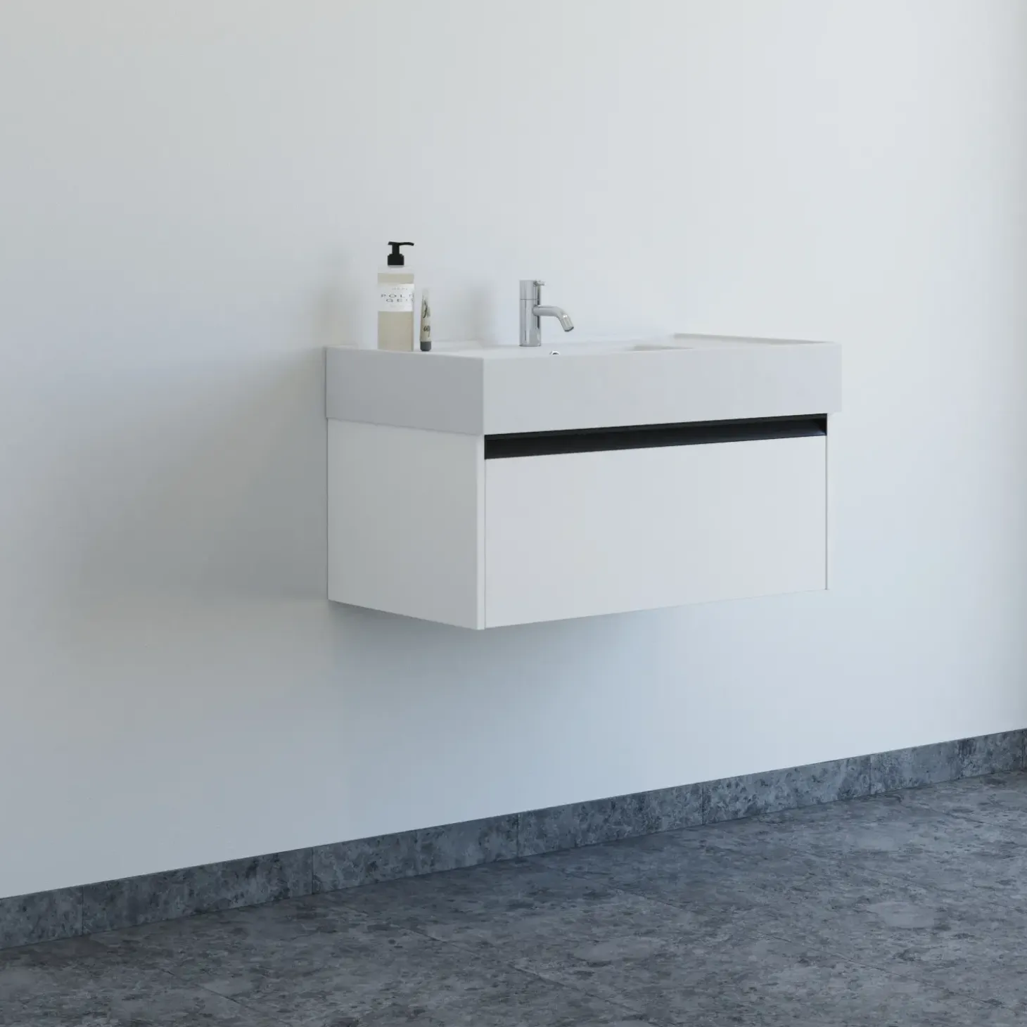 Opgrader dit badeværelse med denne stilrene møbelpakke i 80 cm bredde. Den markante Asyre håndvask i sanitetsporcelæn har et dybt, kantet bassin med flad bund, placeret i højre side for et asymmetrisk og moderne udtryk. Den hårde, blanke overflade er både elegant og nem at rengøre, mens det centrale afløb og armatur gør monteringen enkel og fleksibel. Det tilhørende vaskeskab har én rummelig skuffe med integreret greb, som giver en stilren finish og samtidig er nemt at gribe i uden at samle støv.