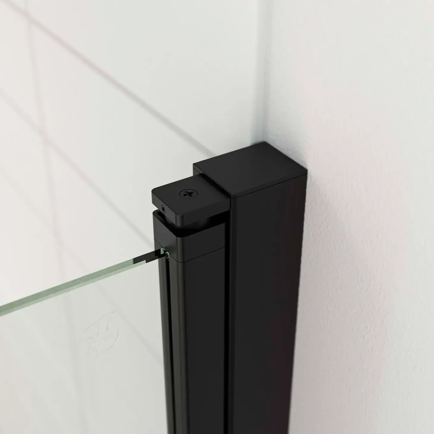 Brusedøren er med 6 mm hærdet sikkerhedsglas med EasyCarebehandling på indvendig side og stærk aluminiumslegering med slidstærk, mat sort overflade. Dørens hængsel er med hæve-sænkebeslag der løfter døren fri af gulv ved åbning og giver selvlukkemekanisme, hvor døren holdes åben ved 90 grader.