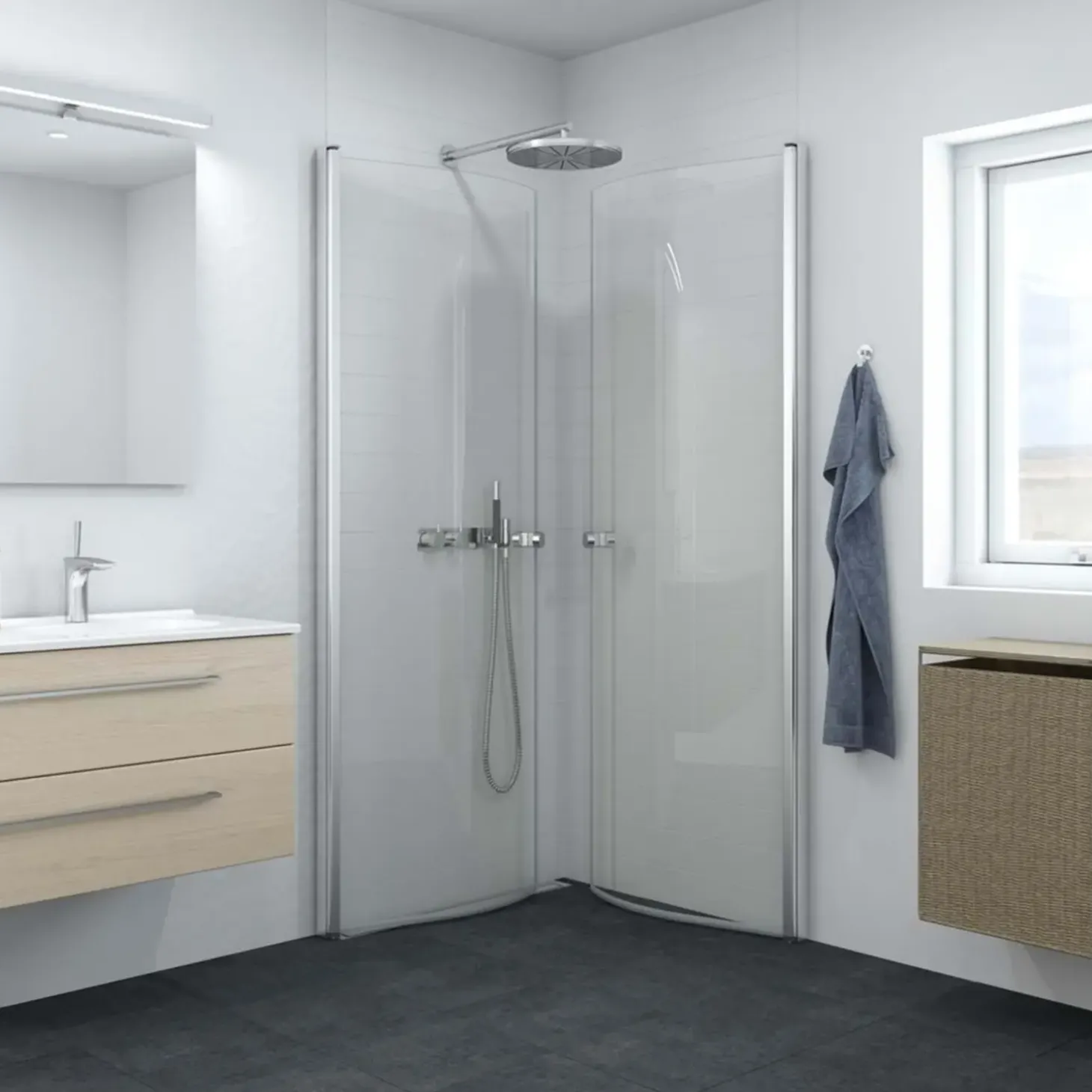 Universel model, der fungerer både som højre og venstre model uden modifikation eller brug af værktøj. Gulvprofil kan tilkøbes til placering under dør, hvilket sikrer optimal vandsikring. Døråbning både udad og indad giver god plads i rummet, når brusehjørnet ikke er i brug.