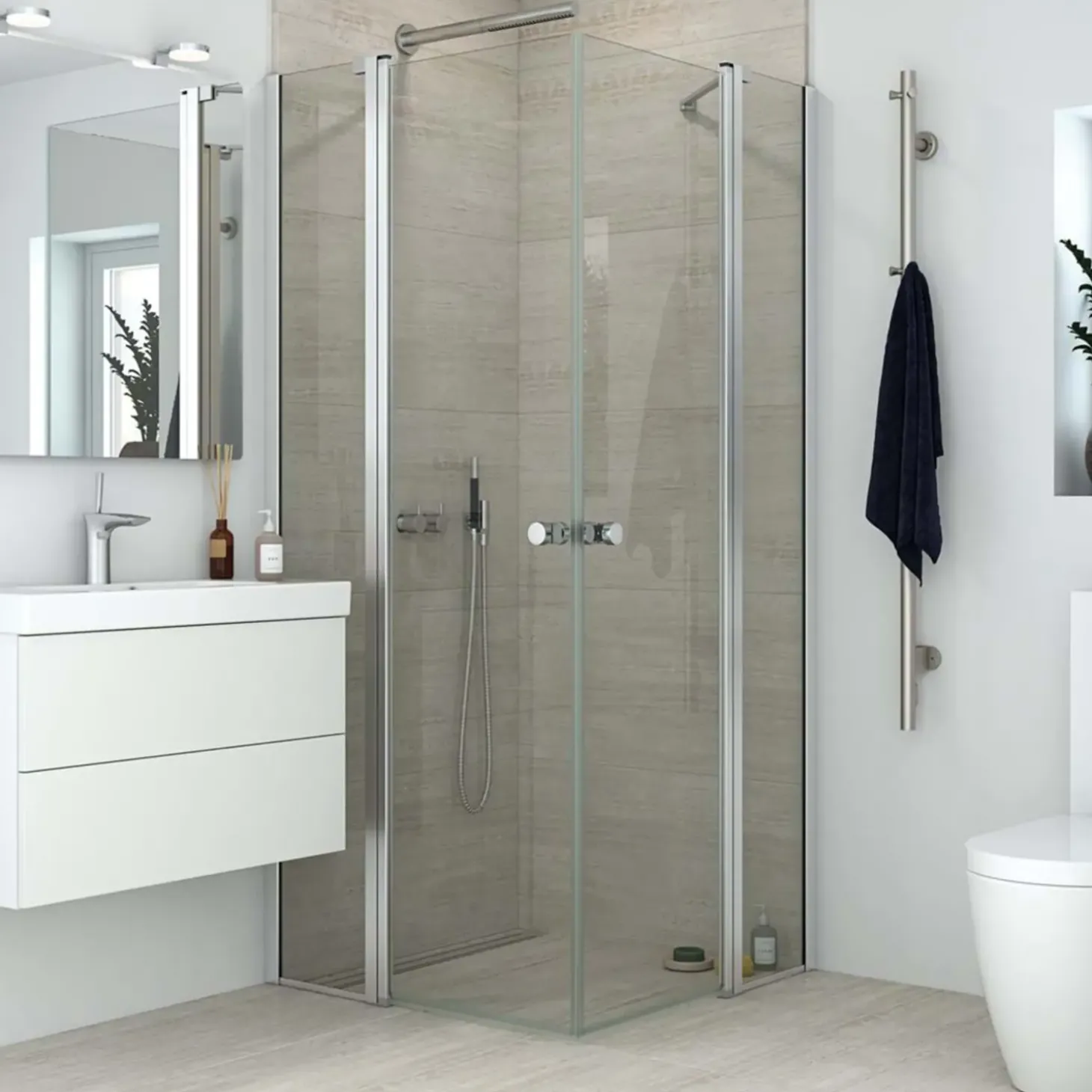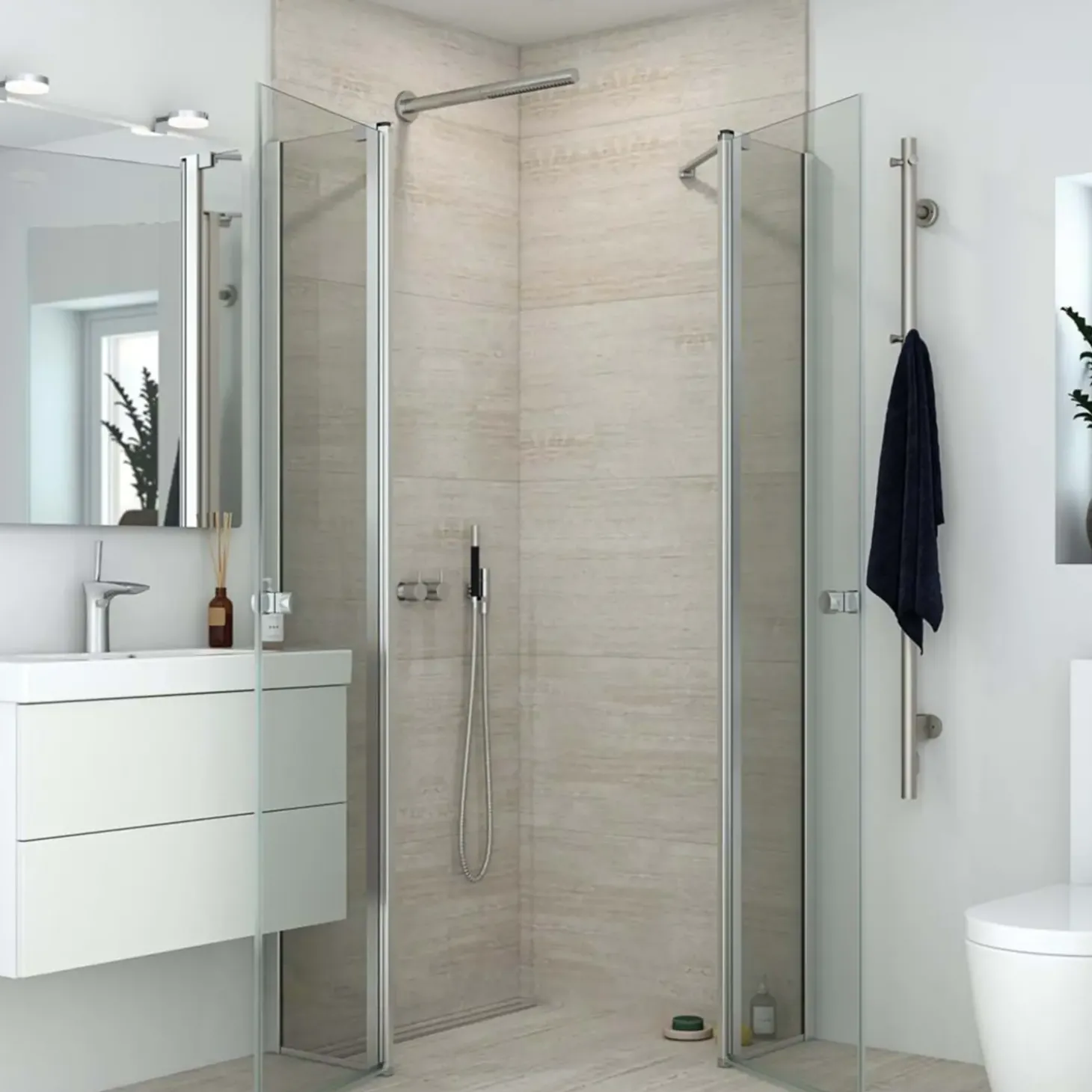 Flot brusehjørne i glas med sidepanel. Denne løsning kan møbleres tættere på afskærmningen, uden at det hindrer dørenes bevægelse. Den elegante arm monteres på toppen af glasset i fast sidepanel, justeres trinløst ind og sikrer stabilitet.