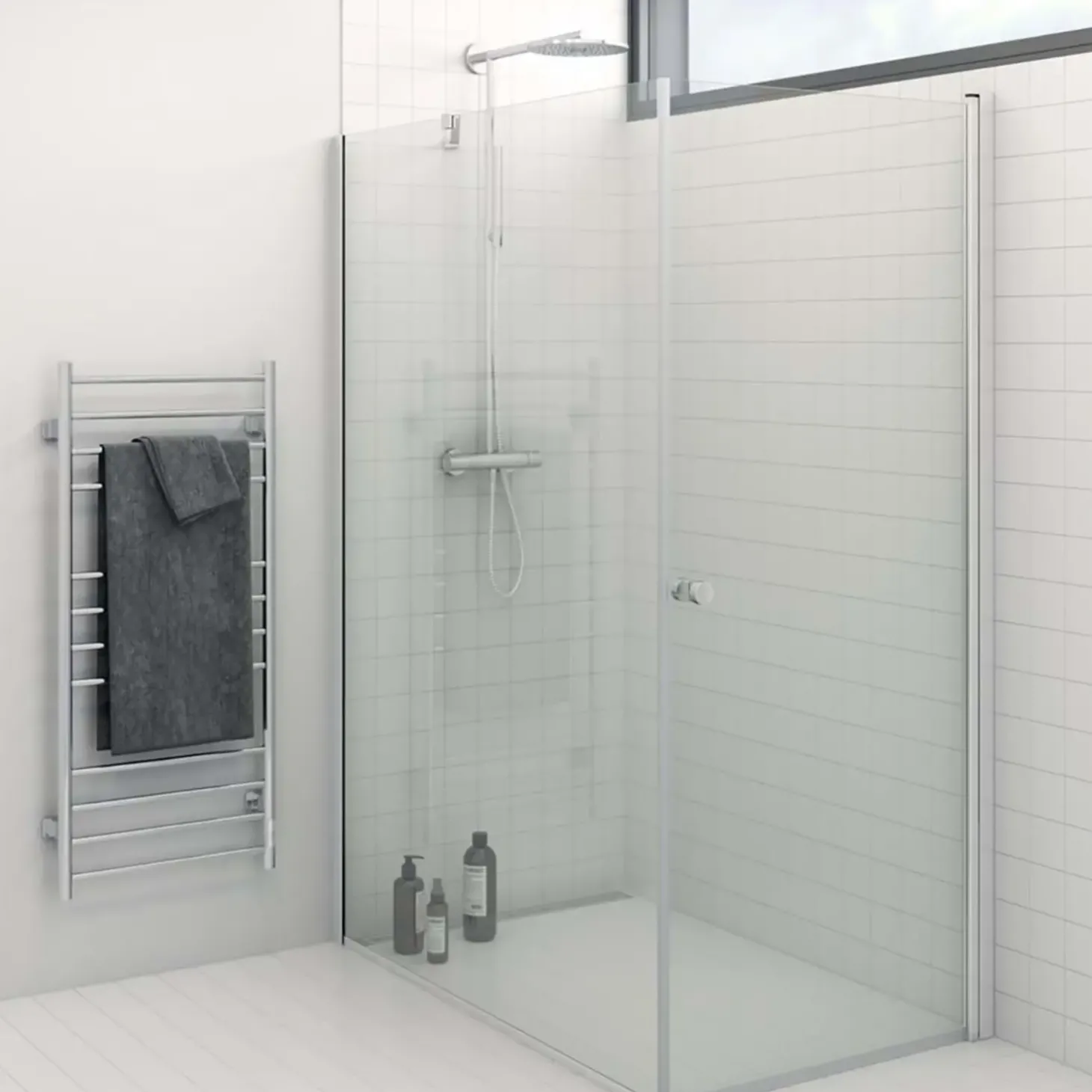 Flot, fast brusevæg fra Scanbad, som er væghængt i klart glas. Modellen er vendbar og kan let justeres og tilpasses i størrelse med teleskopstangen, når den står alene. Denne svingdør er kombineret med brusedør A og stabiliseringsarm der passer til Scanbad Match model D80/90/100, 600mm