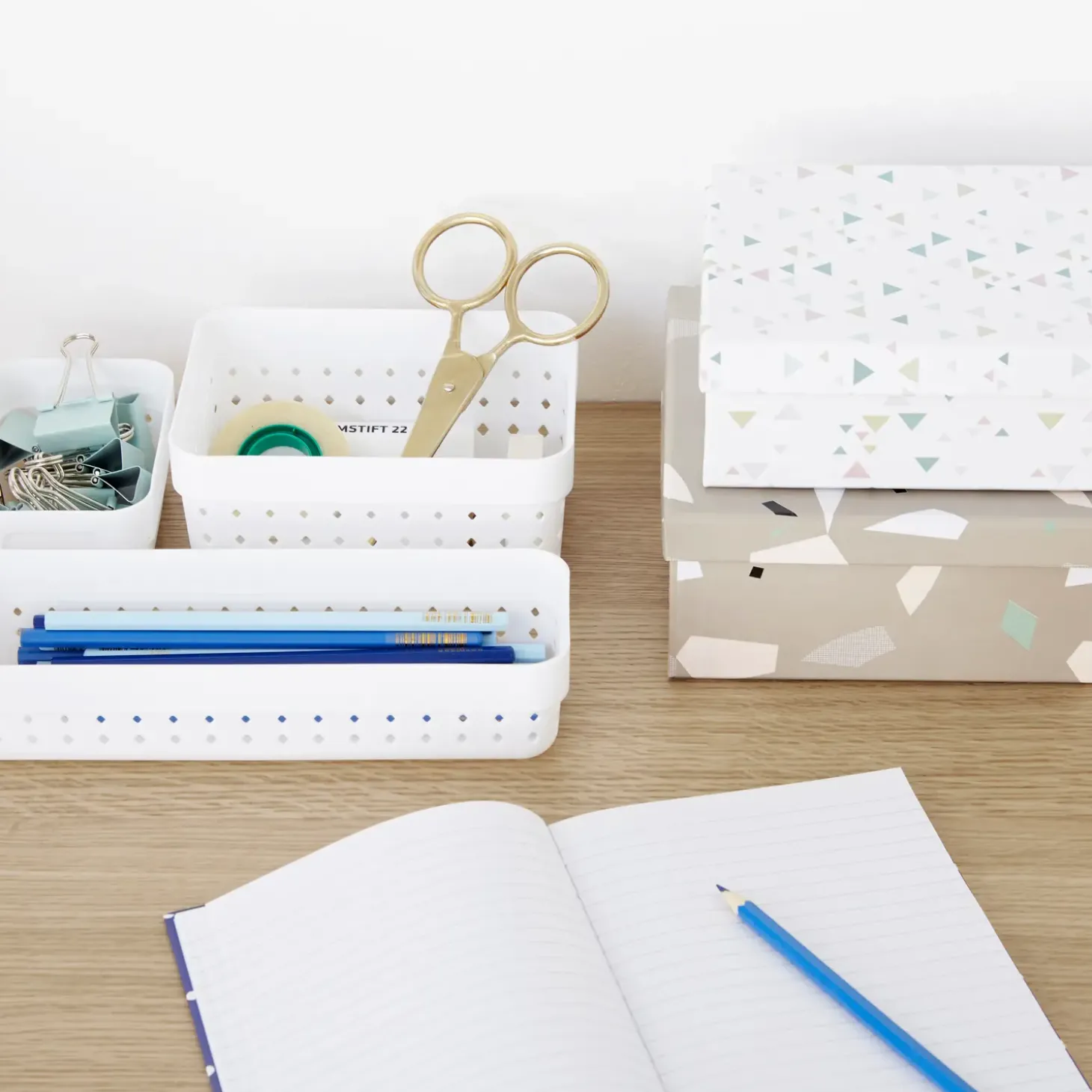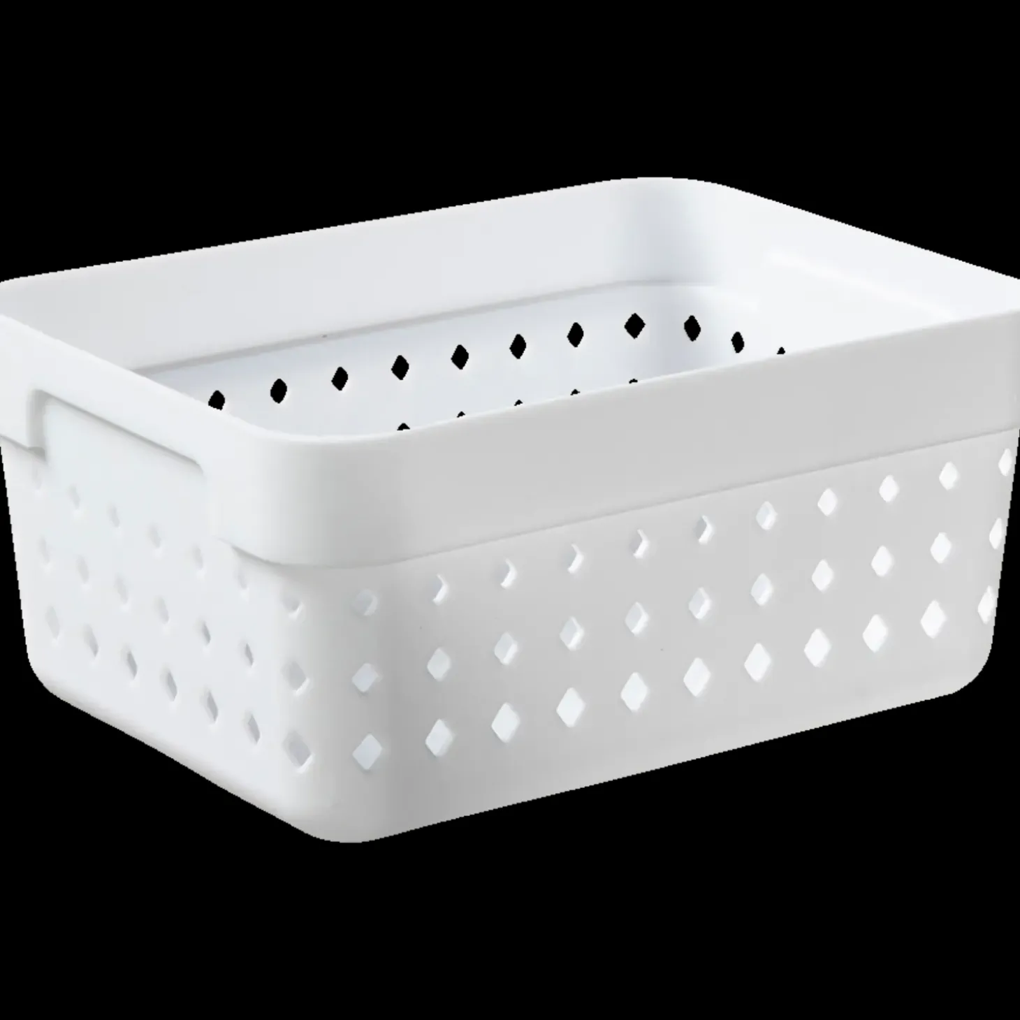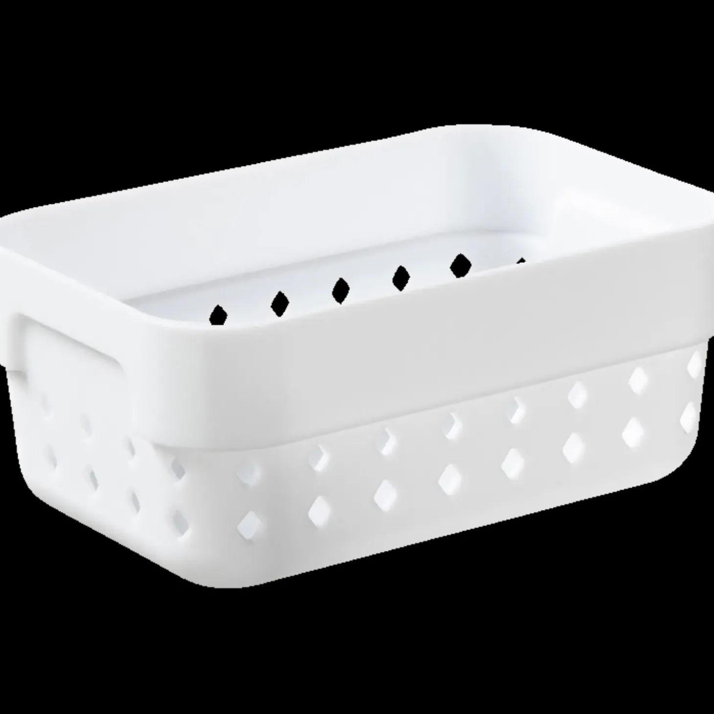 Praktisk små plastkurve der tilbyder et smukt og elegant organiseringssystem til småting, og det passer til ethvert rum i hjemmet. Designet inkluderer diamantformede huller, som tilføjer et moderne look. Kurven af høj kvalitet er ideel til at organisere kuglepenne og andre kontorartikler. Den kan også være ideel til at organisere make-up og andre personlige ting.