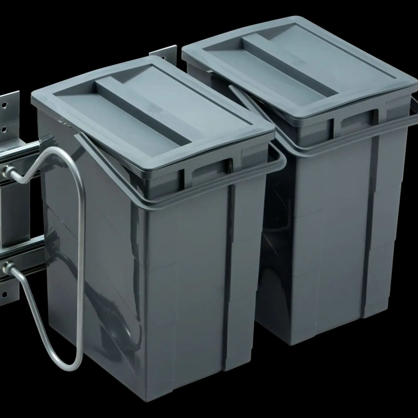 Systemet kan monteres i de fleste skabe, køkken- som bryggers skabe mv. Udtrækkene kan vendes, så det kan bruges både i højre og venstre side. Spandene er med låg i plast og kan hver rumme 10 liter.