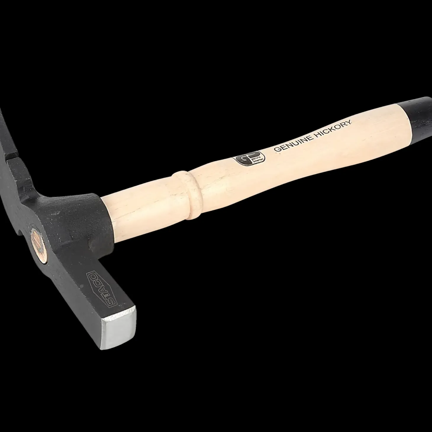 Murerhammer fra Staco med smedejern hoved, hærdet firkantet slagflade samt bredt slebet mejsel. Endvidere er denne håndsmedet hammerhoved med træskaft i hickory.