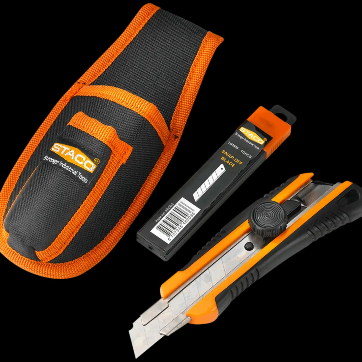 Solid 18 mm skærekniv i handy cordura-skede Skærekniven er lavet af plast med metalglans og SoftGrip-håndtag, der sikrer et godt greb og øger nøjagtigheden. Klingen styres let ved hjælp af en enhånds hjullås. Skaftet er indlejret med et magasin til 2 ekstra blade. Kniven kommer også med 10 ekstra blade. Den praktiske cordura skede, der kan sættes på dit bælte, indeholder både kniv og ekstra blade.