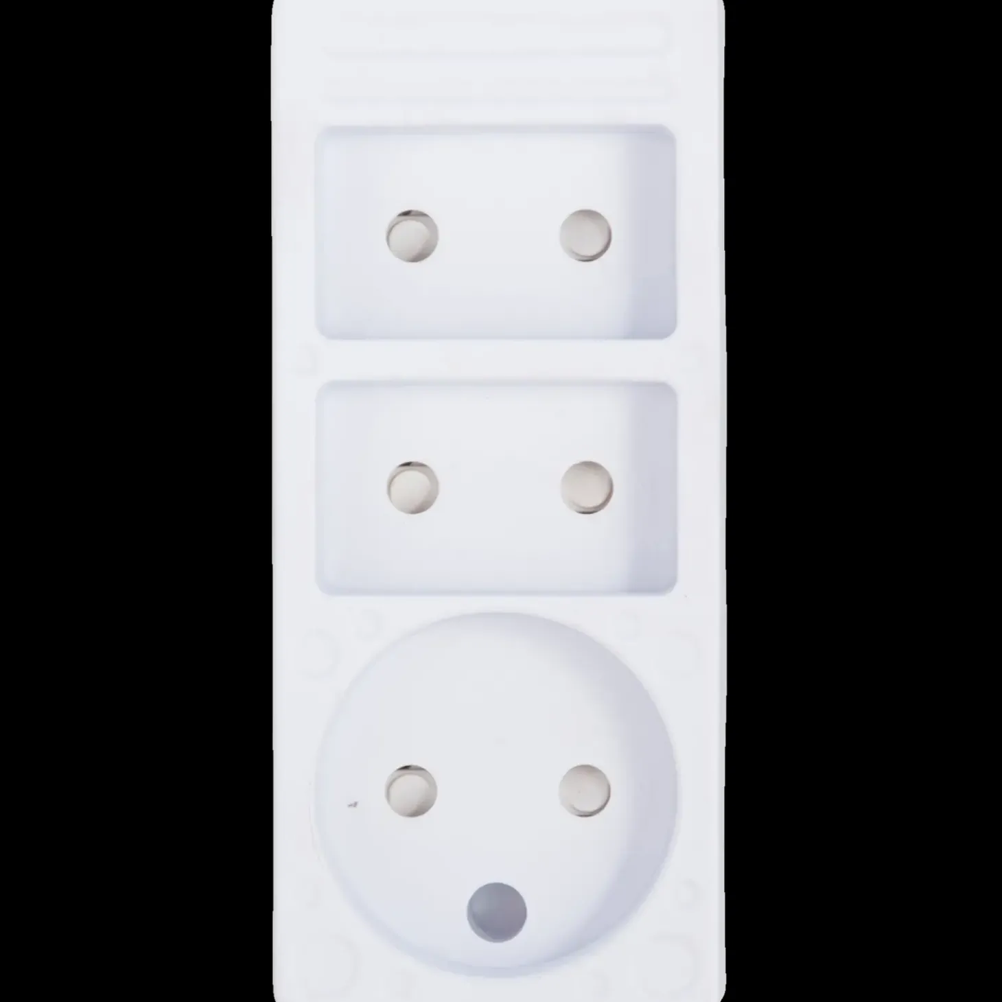 Stikdåse 3-vejs 2 flade + 1 rundt udtag uden jord børnesikker med dommy hul for jord.