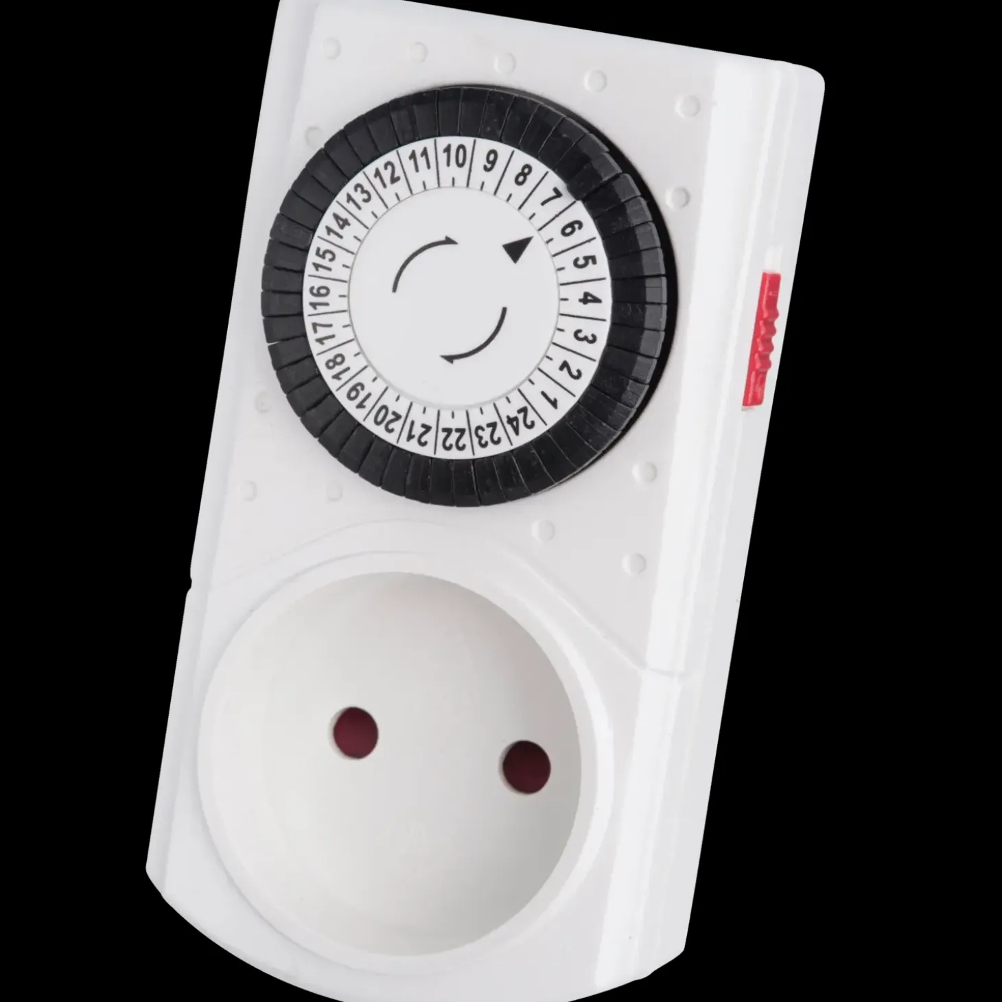 E-Line mekanisk mini døgnur uden jord. Et tænd og sluk ur giver mulighed for at indstille hvornår strømmen skal være slukket i en given stikkontakt. Min indstilling pr. pind er 30 minuter. Maks. 48 tænd/sluk pr. dag