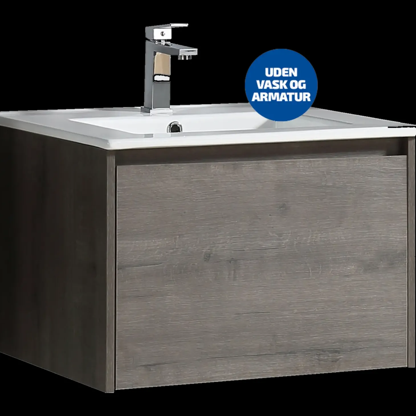 Vaskeskabet har et stilrent og moderne design med grebsfri skuffe og soft-close, der sikrer en rolig lukning af skuffen, samt indvendig udskæring til rørføring.
