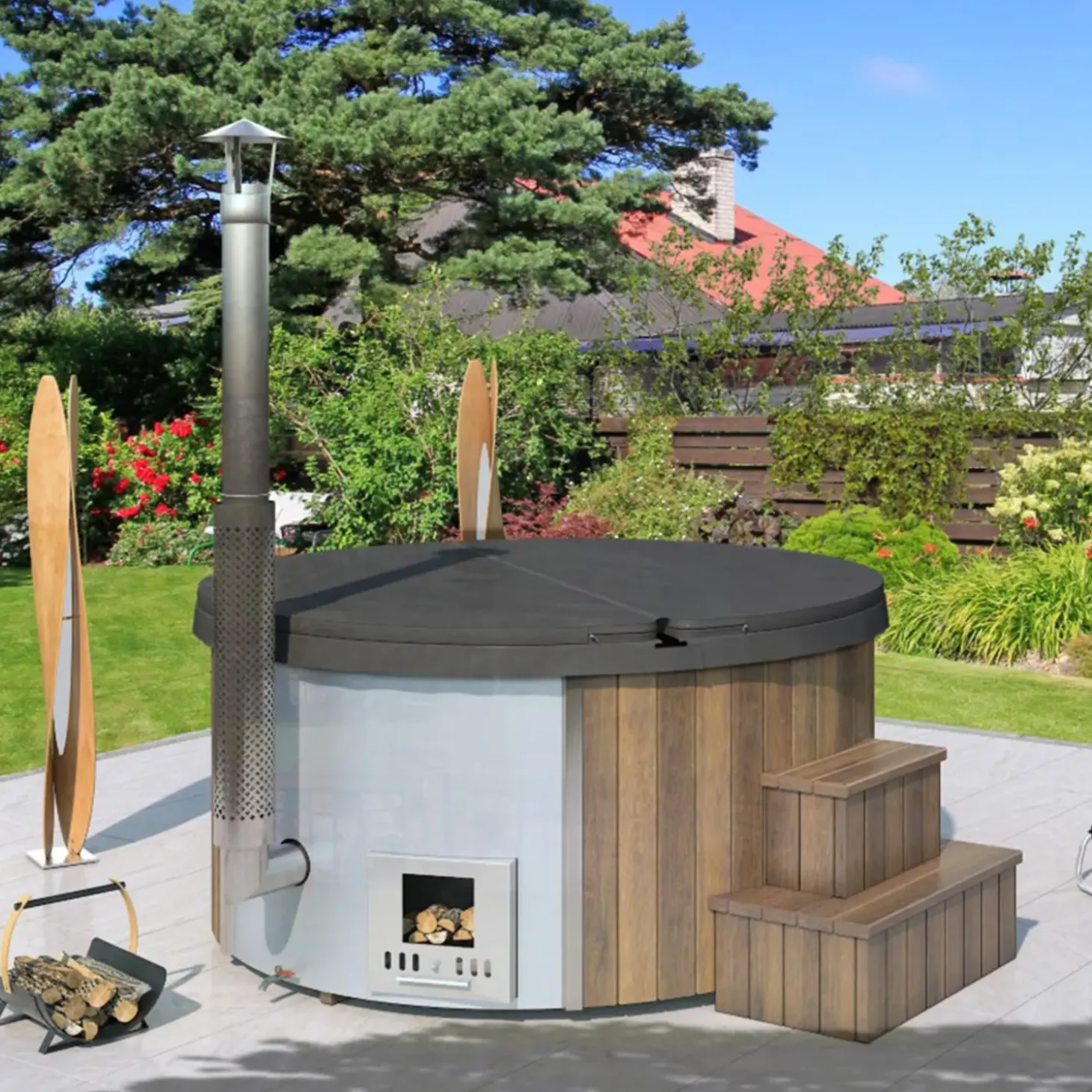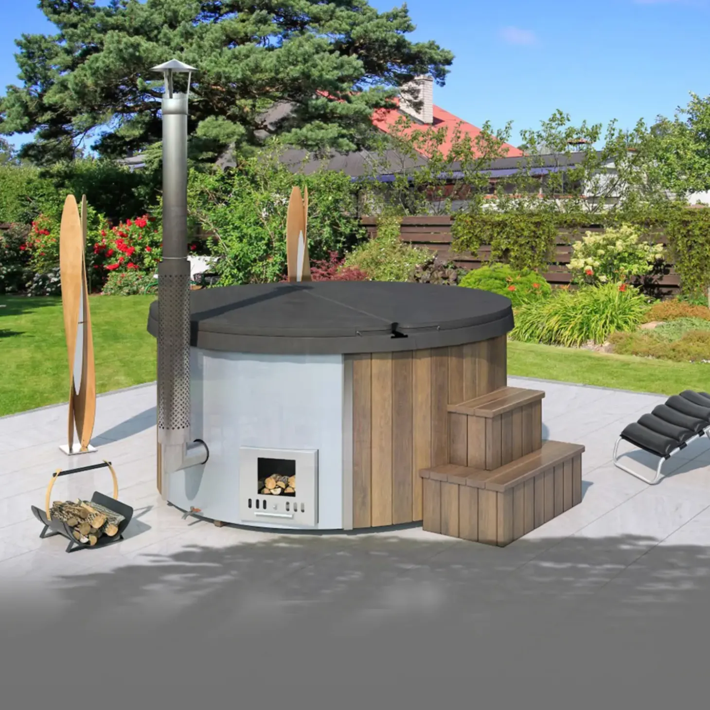 Derudover kommer badet med isolerende cover der er fremstillet i 7-10 cm imiteret læder, så varmen holdes inde. Ligeledes hjælper coveret til en nemmere rengøring samt vedligeholdelse, da blade og snavs ikke kommer i kontakt med vandet. Og med vildmarksbadets trappe i Thermowood får du nem adgang til badet.