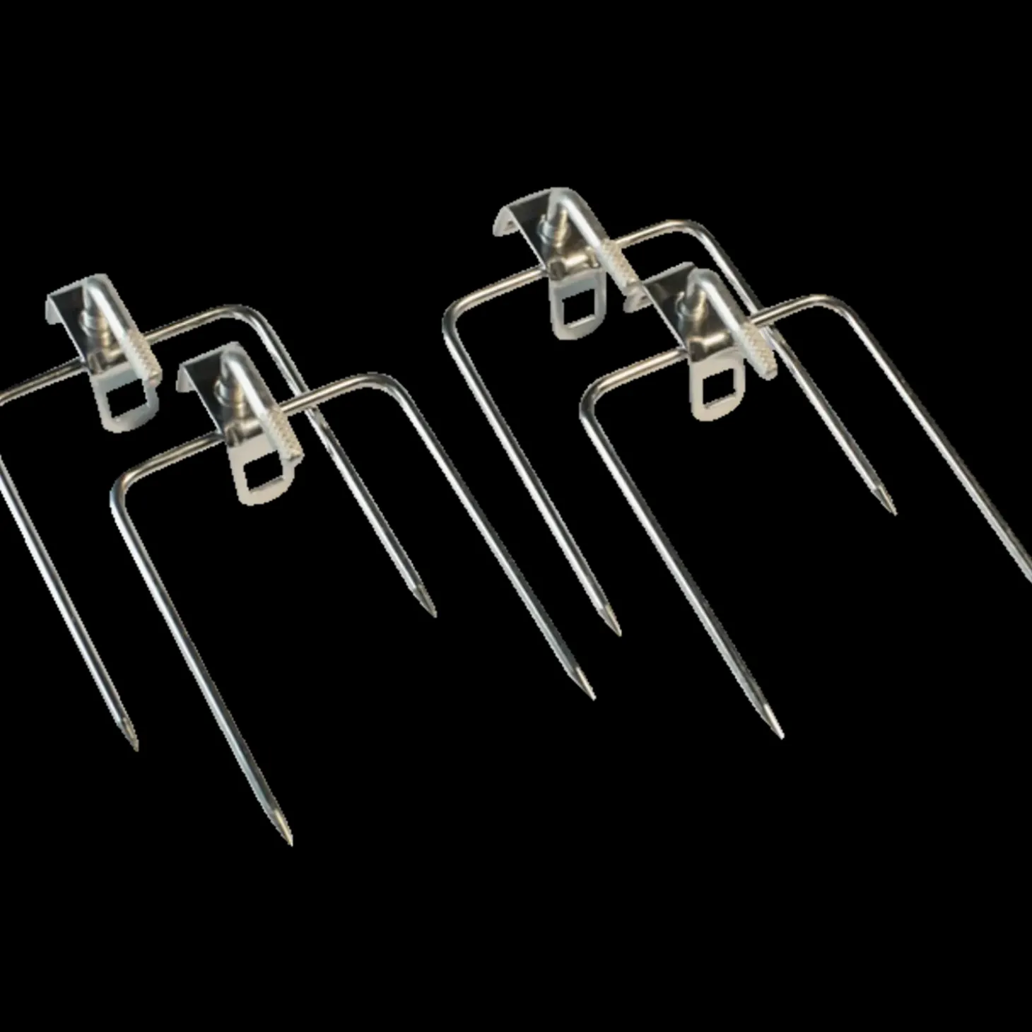 Disse spydgafler til Weber rotesseri kan anvendes til at holde din kylling, pattegris eller lam på en spydstang. Gaffelsættet er lavet af forkromet stål og har 2 spidser hver, der sørger for, at kødet sidder sikkert på spyddet, når det drejer over varmen. Gaflerne kan fastgøres på stangen med de medfølgende monteringsskruer.
